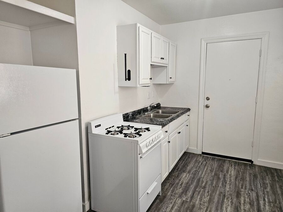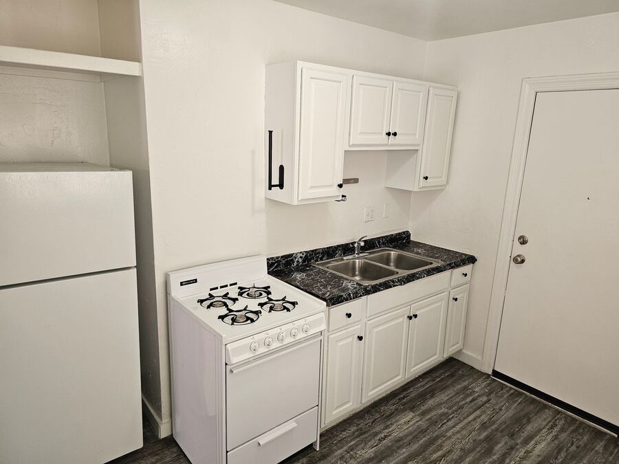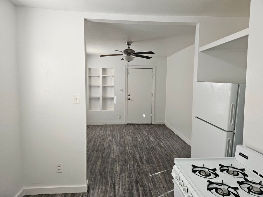 The unit features vinyl plank in it's entirety plus ceiling fans in both bedrooms and living room areas. The kitchen is equipped with a gas stove and refrigerator.