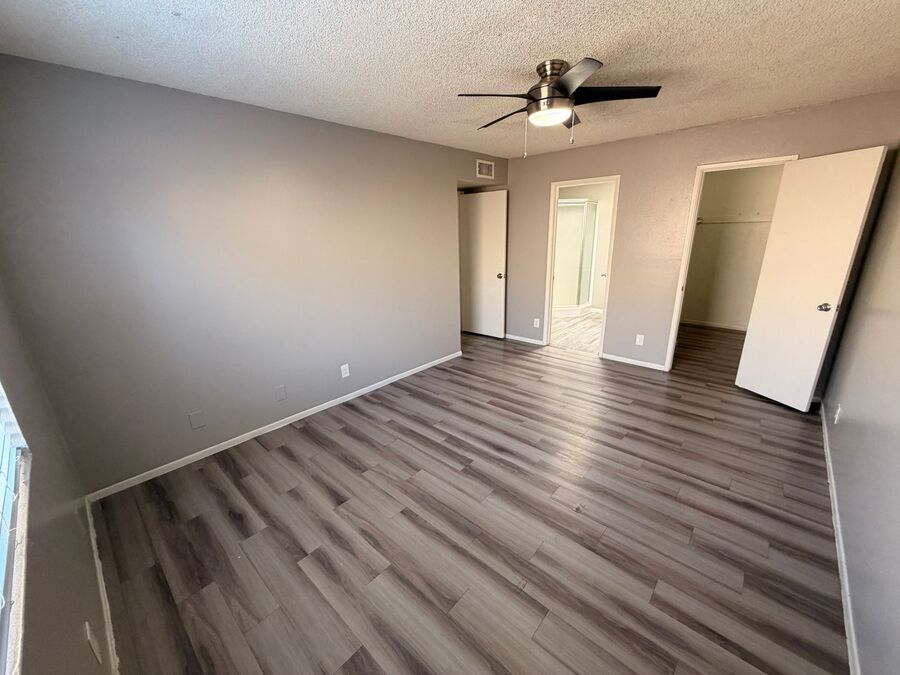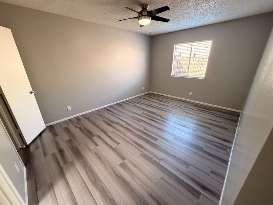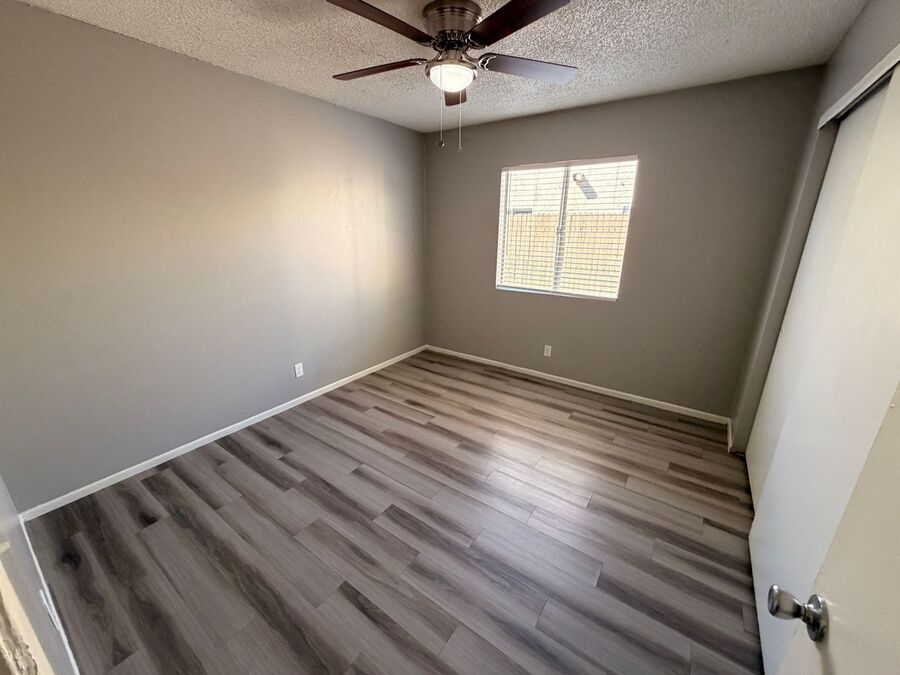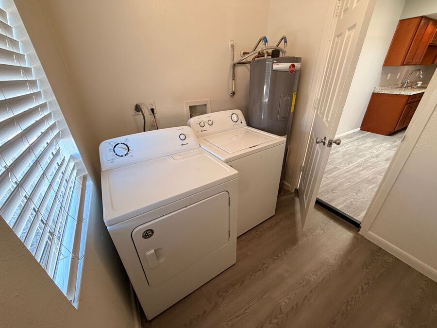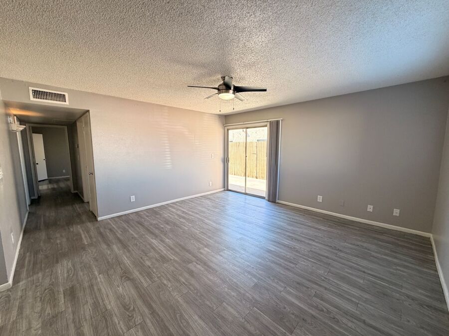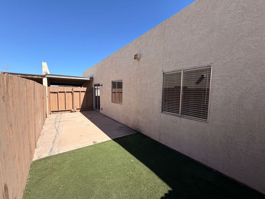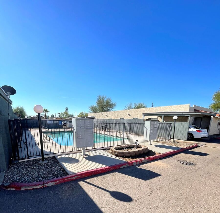 Generously sized 2 bedroom 2 bathroom unit located in Glendale with wood plank flooring and custom grey paint throughout. As you walk-in the front door, you will be greeted by a bright open concept living room and eat-in kitchen area. The kitchen has updated shaker style cabinets, double sink and full stainless steel appliance package. The primary bedroom also has an updated vanity in the private bathroom and walk-in closet. Other amenities include a dedicated laundry room with washer/dryer, carport and an enclosed patio with private yard area. This cozy community has a pool for the hot Arizona summer, a dog station and close to historic area of Glendale, shopping and restaurants. Pet-friendly for up to two small spayed/neutered pets with a $300 deposit per pet and $35 monthly pet rent.