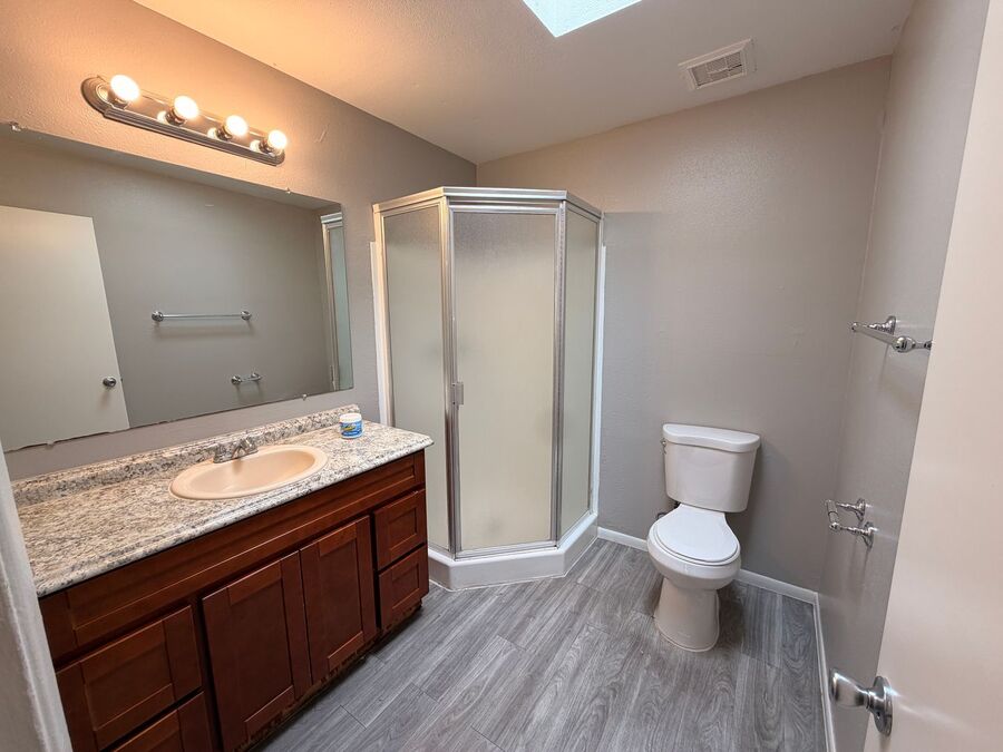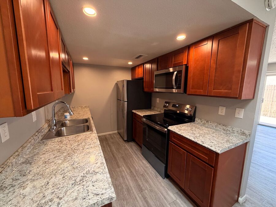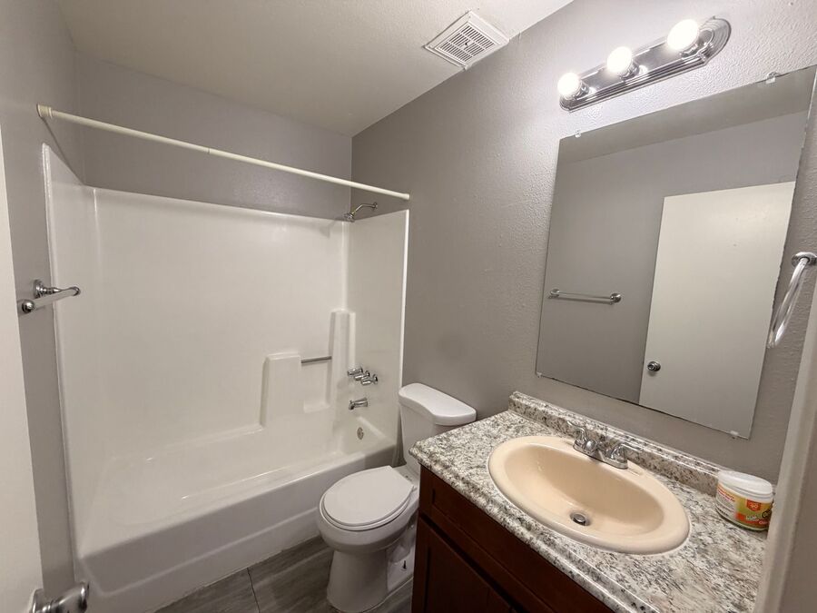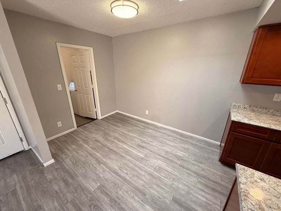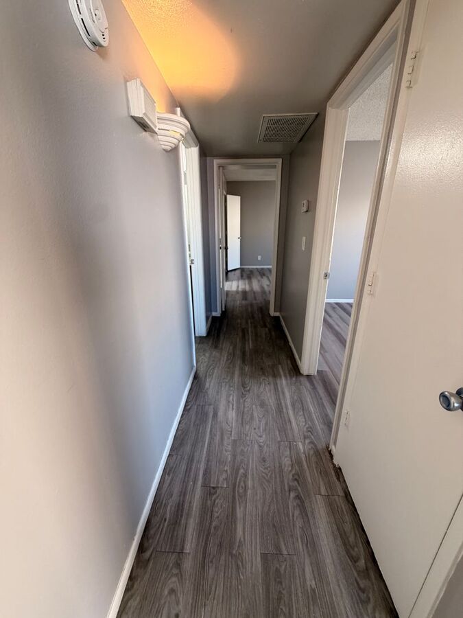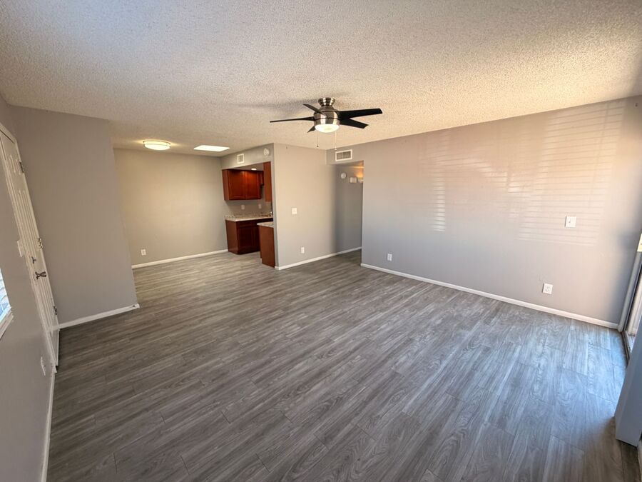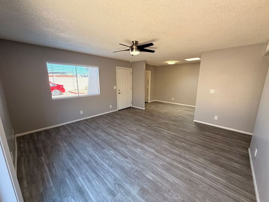 Generously sized 2 bedroom 2 bathroom unit located in Glendale with wood plank flooring and custom grey paint throughout. As you walk-in the front door, you will be greeted by a bright open concept living room and eat-in kitchen area. The kitchen has updated shaker style cabinets, double sink and full stainless steel appliance package. The primary bedroom also has an updated vanity in the private bathroom and walk-in closet. Other amenities include a dedicated laundry room with washer/dryer, carport and an enclosed patio with private yard area. This cozy community has a pool for the hot Arizona summer, a dog station and close to historic area of Glendale, shopping and restaurants. Pet-friendly for up to two small spayed/neutered pets with a $300 deposit per pet and $35 monthly pet rent.