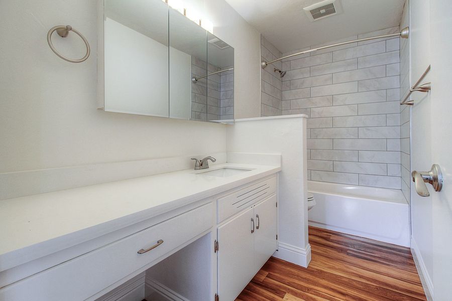 - Laminate wood and stone-looking floor throughout