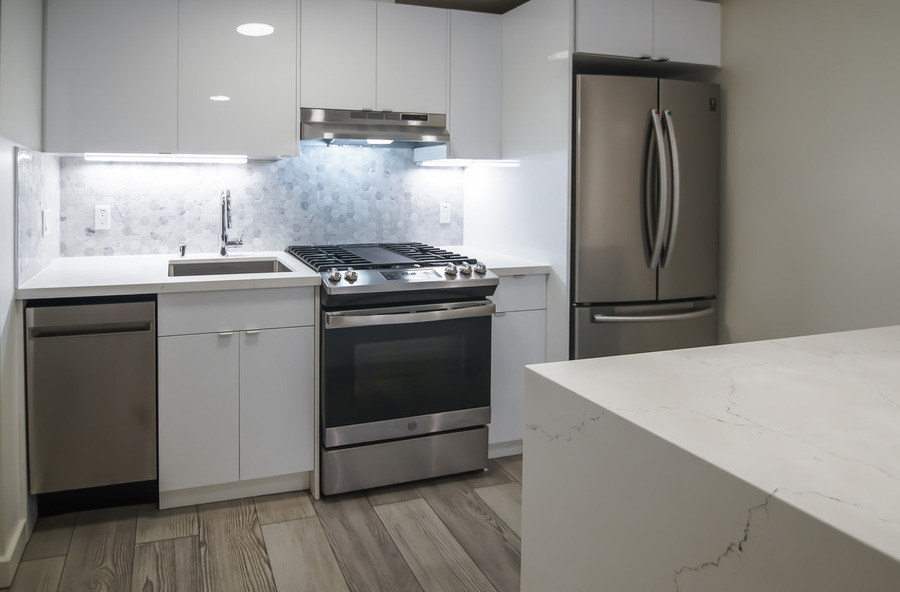 The contemporary kitchen features stainless steel appliances, quartz countertops, and ample cabinet space — ideal for both cooking and entertaining.