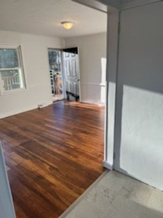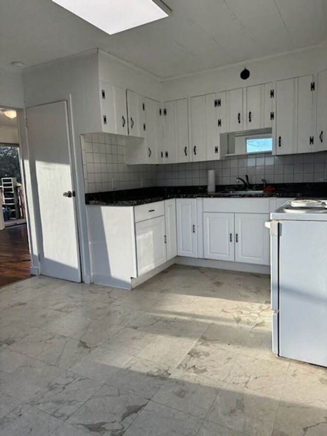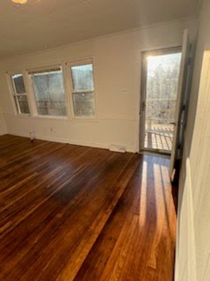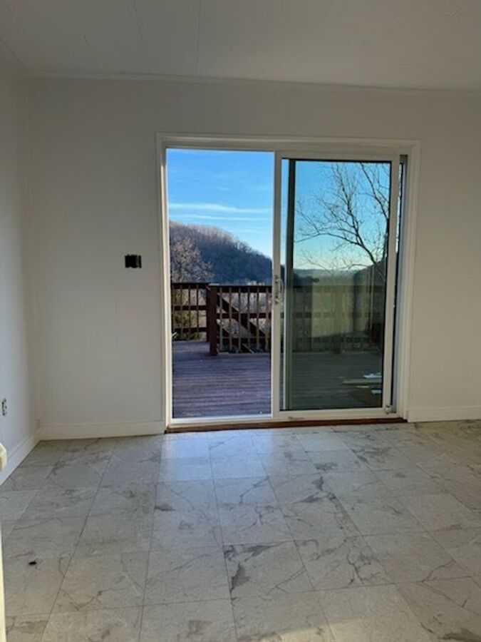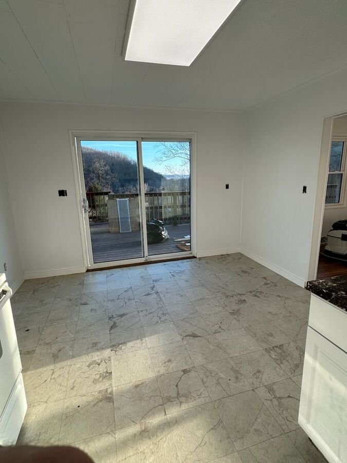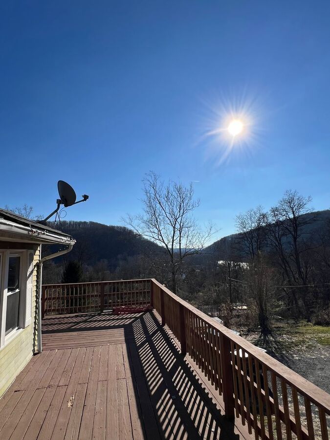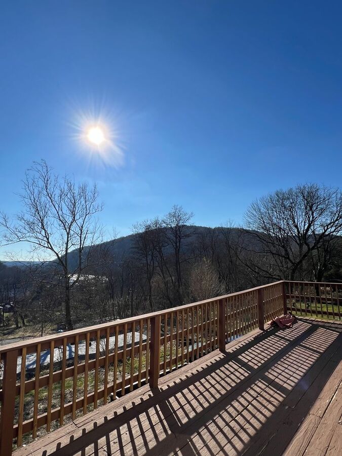 Step inside to find beautifully refinished hardwood floors throughout the living areas and bedrooms, complemented by fresh paint and abundant natural light pouring through generous windows on all sides. The spacious eat-in kitchen features white cabinetry, and marble-look tile flooring, with sliding glass doors opening directly onto the expansive wraparound deck — ideal for morning coffee or evening sunsets over the mountains.
