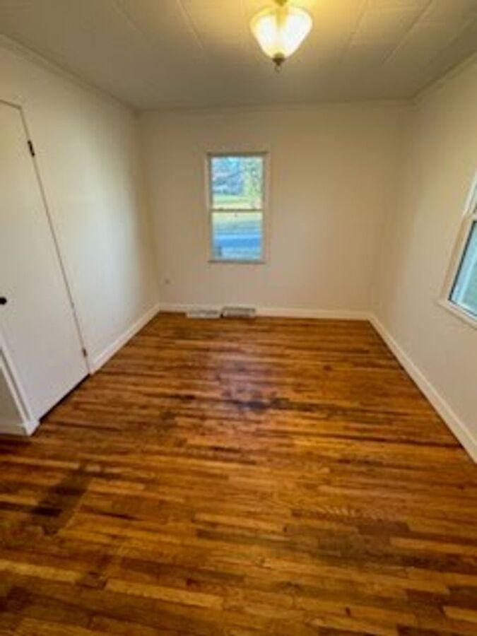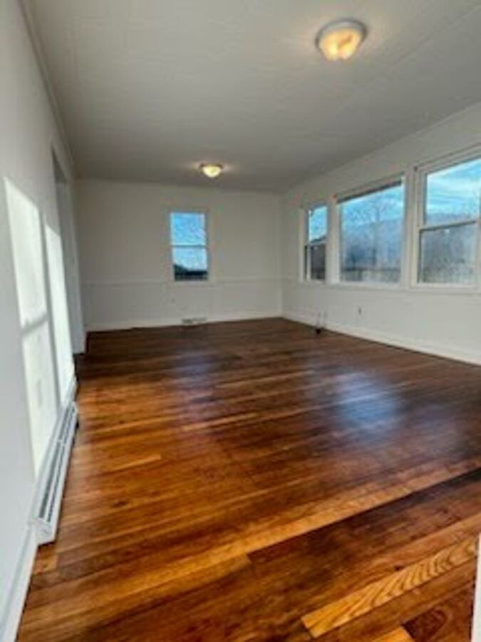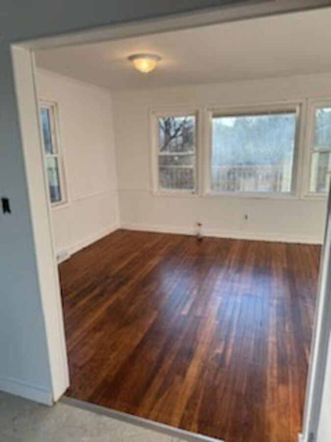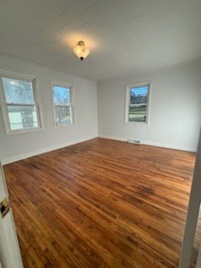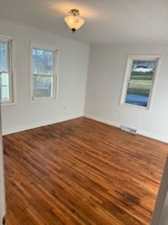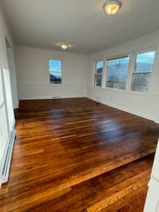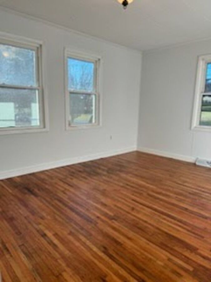 Step inside to find beautifully refinished hardwood floors throughout the living areas and bedrooms, complemented by fresh paint and abundant natural light pouring through generous windows on all sides. The spacious eat-in kitchen features white cabinetry, and marble-look tile flooring, with sliding glass doors opening directly onto the expansive wraparound deck — ideal for morning coffee or evening sunsets over the mountains.