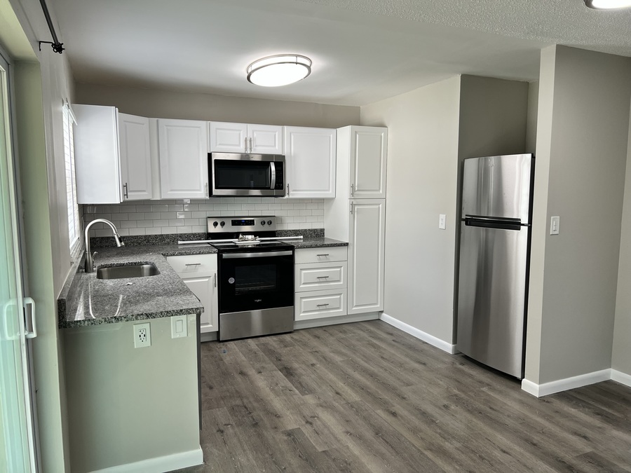 Newly renovated with brand new white cabinets and stainless steel appliances in kitchen