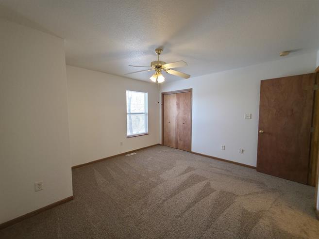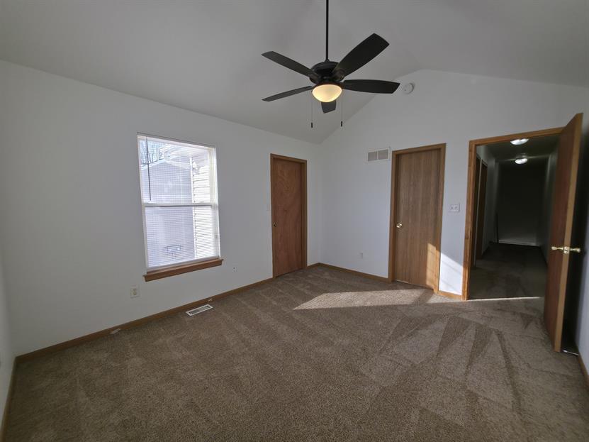 Upstairs, the spacious primary suite features plush carpet, a large closet, ceiling fan, and a private bath with tile floors, a large vanity, and a walk in shower. The second bedroom boasts vaulted ceilings, great natural light, and a walk in closet. The third bedroom is comfortably sized and versatile.