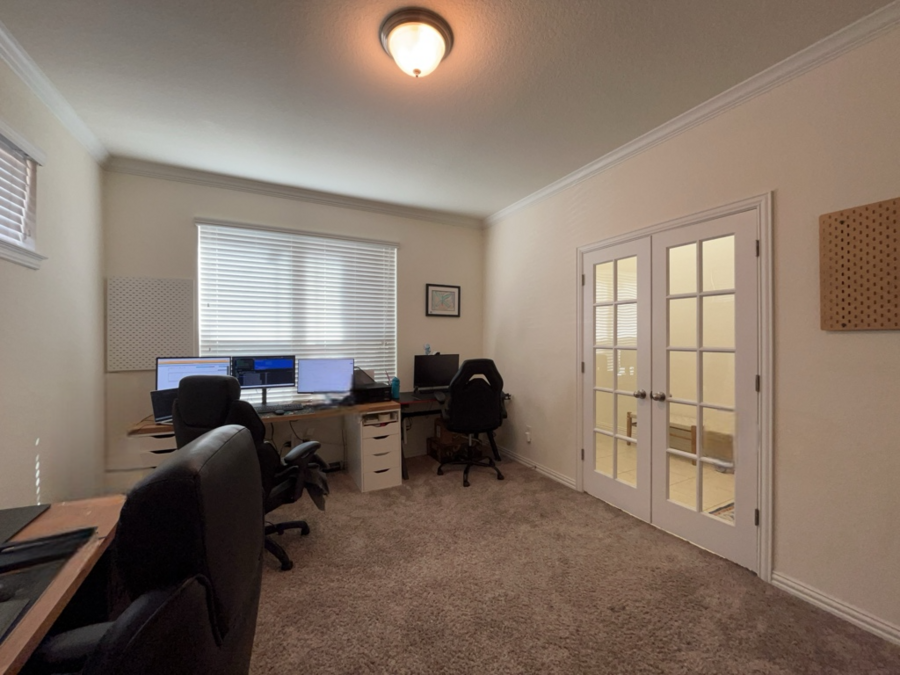 Step inside to a stunning living and dining room combination featuring floor-to-ceiling windows and soaring high ceilings, creating a bright and airy atmosphere. A dedicated office or studio space provides the perfect spot for working remotely or pursuing creative interests.