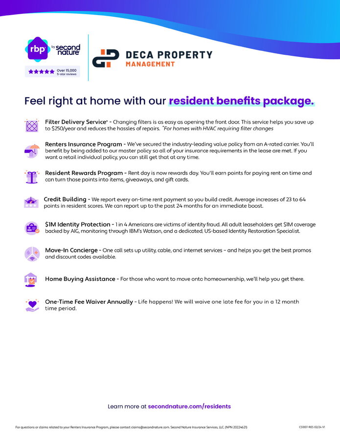 Resident Benefit Package: https://www.decarealty.com/wp-content/uploads/2023/01/Deca_Property_Management_RBPFlyer_011723.pdf