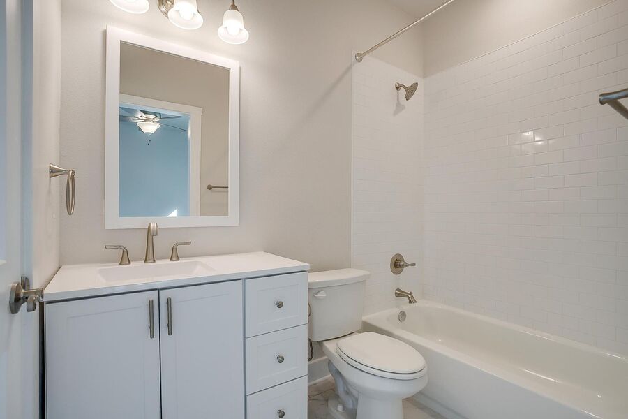TCU housing at its best. There are 5 generous private bedrooms, each with a private bathroom and private coded door lock. The common floor features solid surface floors, a balcony, large open living area with flat screen TV, powder bath, and a kitchen your parents will envy. There are 2 bedrooms on the 1st floor and 3 on the 3rd floor with a set of washers and dryers on each floor – so no schlepping up and down the stairs to do your laundry. Parking is private, well lit, fenced, off street, and onsite.