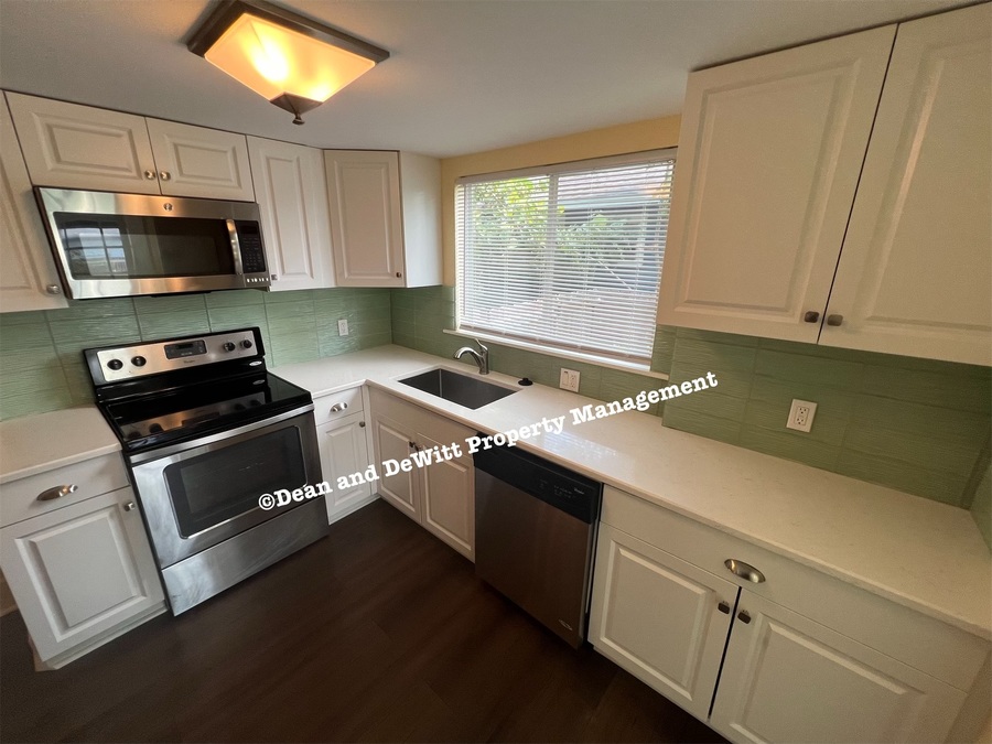 New kitchen with stainless steel appliances, quartz countertops and white cabinets