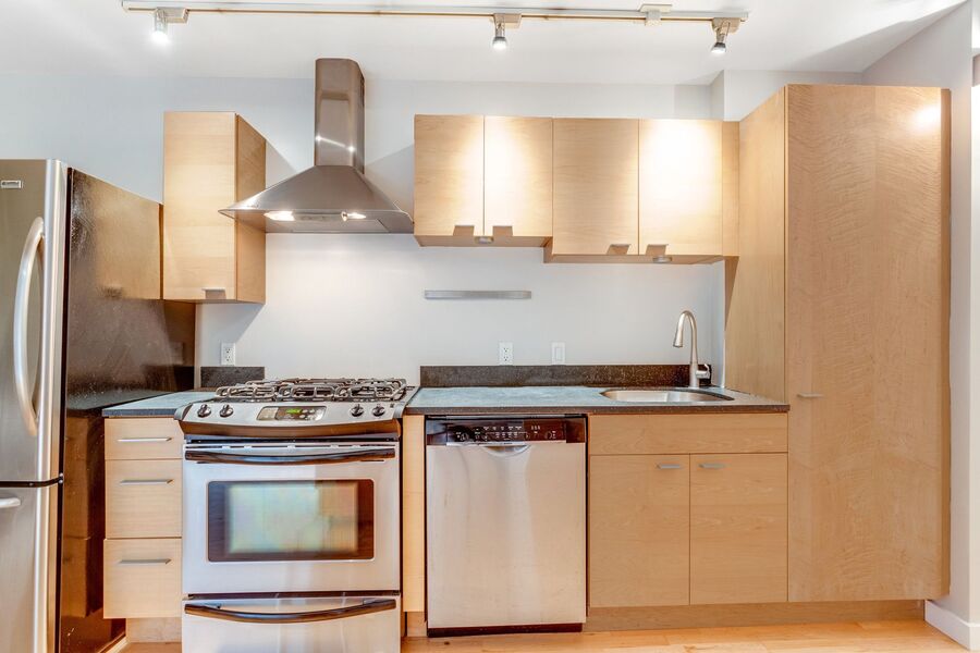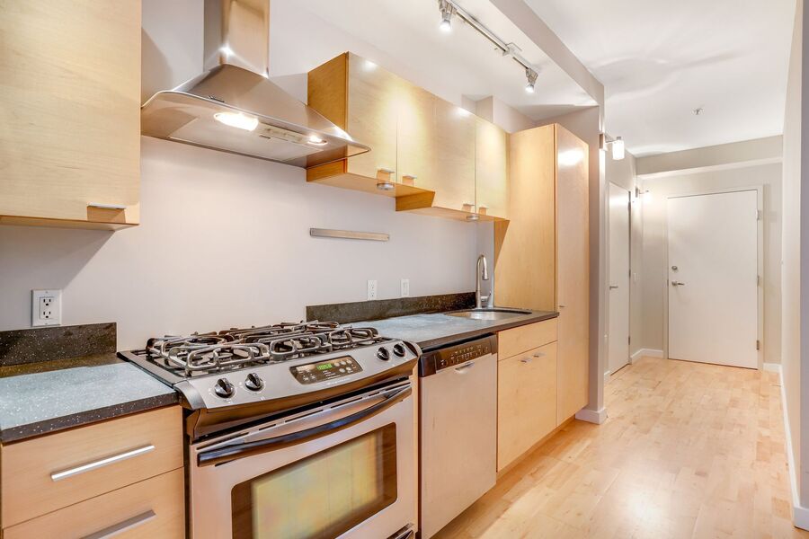 This amazing unit is the ideal urban perch with 1 bedroom + den and 1.5 bathrooms! Don’t miss the inviting wood floors throughout, large scenic windows, and open-concept floor plan. As you enter, you will find the spacious floor, featuring a gourmet kitchen fitted with everything you need including stainless steel appliances (including a gas range), plenty of cabinets, and stone countertops. Continue to the open dining and living area, and the spacious and bright main bedroom and en-suite bathroom.