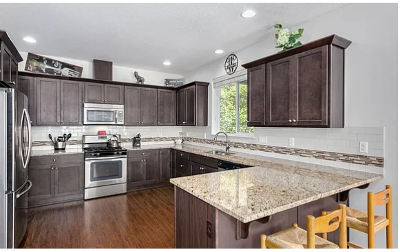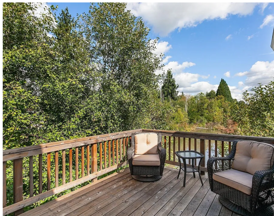 The kitchen flows effortlessly into the dining and living areas, anchored by a cozy gas fireplace, and features slab granite countertops, an under-mount sink, pantry, stainless steel appliances, and a gas range. Step outside to the expansive covered outdoor living area accessible from both the great room and the primary suite—an ideal spot to relax and enjoy the peaceful surroundings year-round. The vaulted primary en suite offers a private deck, walk-in closet, soaking tub, and double vanity. Additional features include generous walk-in storage beneath the home and quality construction throughout. Located just minutes from Nike and Intel, this tranquil retreat offers the perfect blend of scenic beauty and everyday convenience.