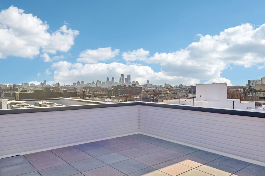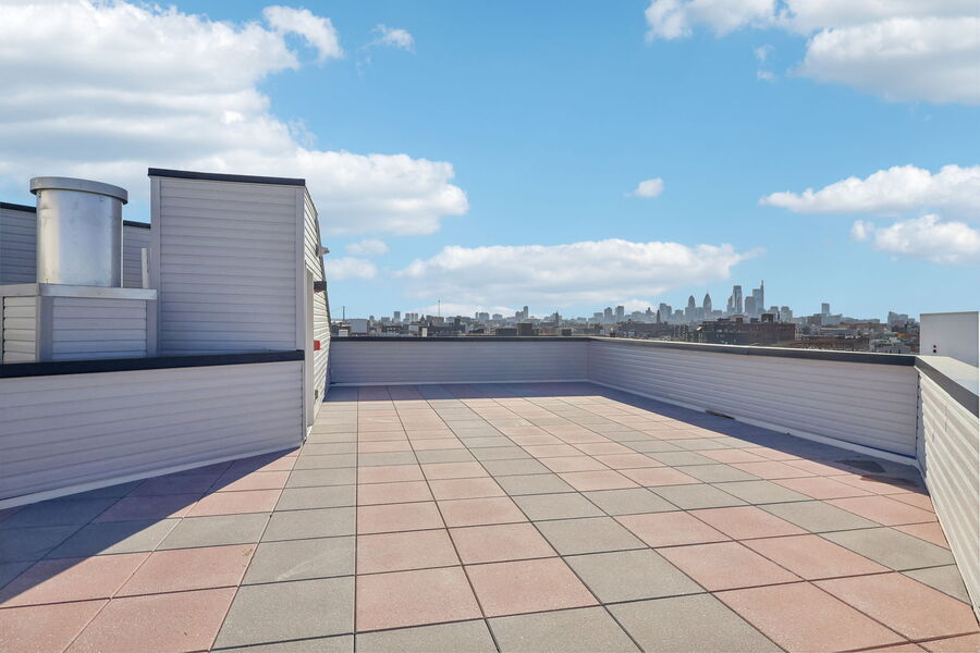 Large roof deck with stunning views of the city, accessible via elevator and stairway.