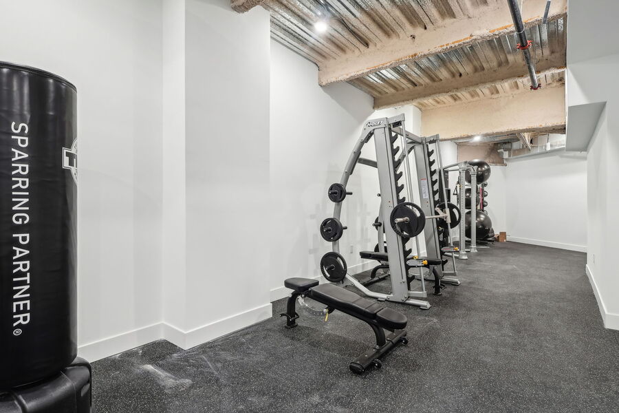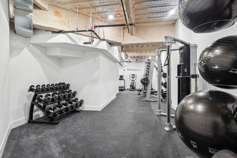 Fully equipped gym featuring Star Trac equipment and free weights.