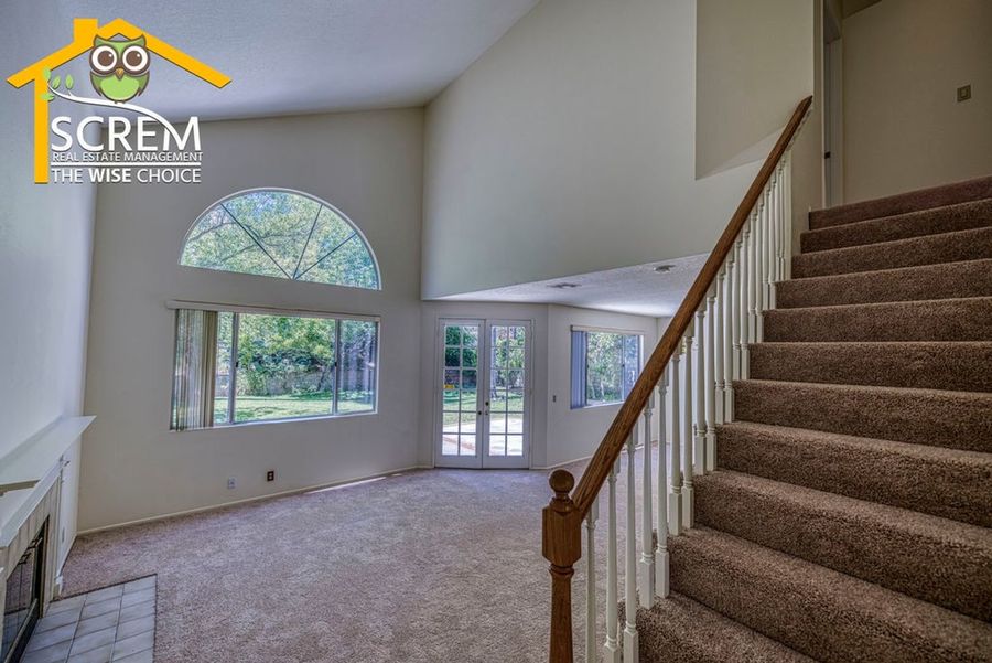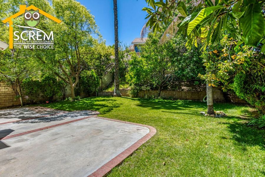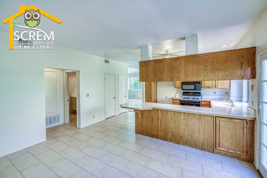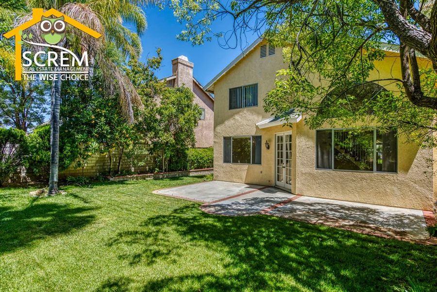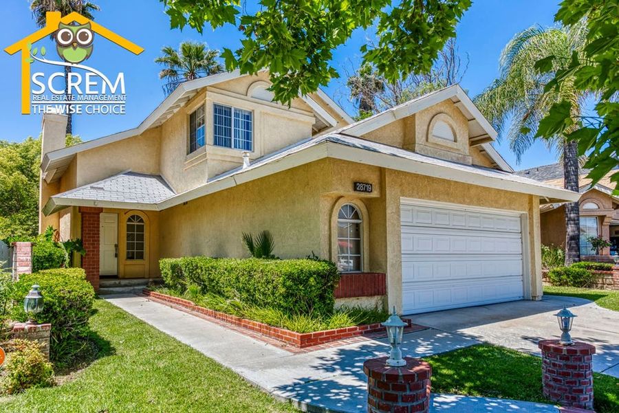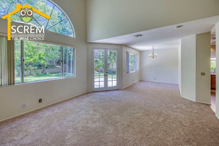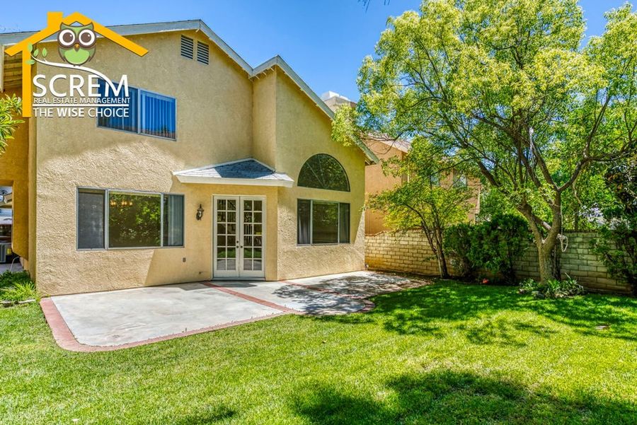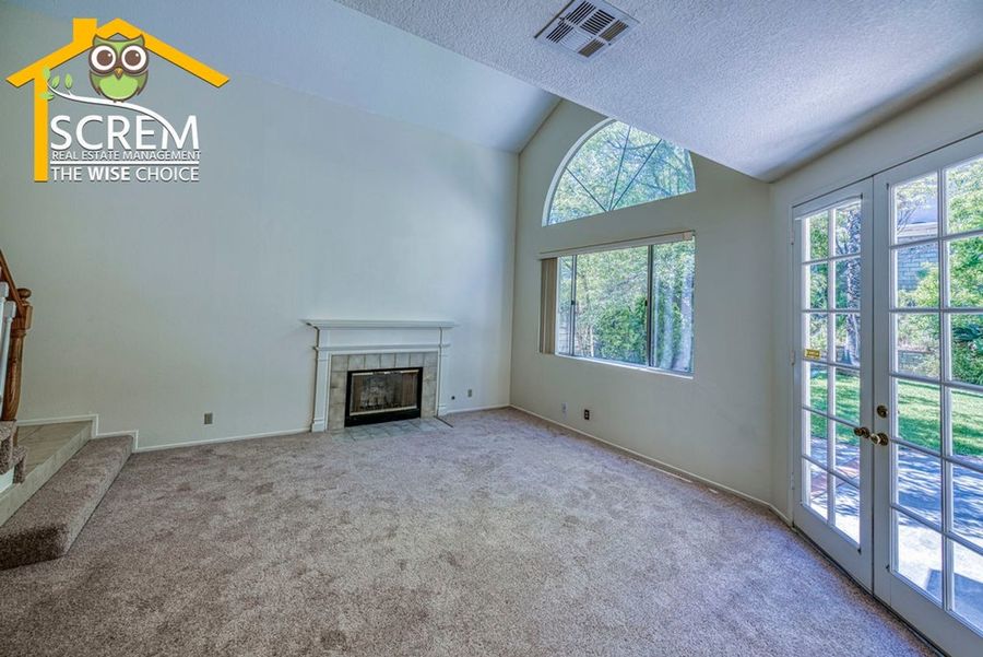 Wonderful three-bedroom home in Saugus features attractive landscaping and a brick-lined walkway. The tiled entryway leads down to a spacious formal living room with vaulted ceilings, carpet flooring, and a cozy fireplace. Adjacent to the living room is a formal dining room with a French door that leads to a large, beautifully landscaped private backyard, equipped with a patio. The kitchen boasts ceramic tile flooring, a large garden window, a ceiling fan, a separate pantry, and a breakfast bar. Kitchen appliances include a gas stove, a single oven, a dishwasher, and a microwave. The family room, which also features ceramic tile flooring and has a French door that opens to the backyard. Additionally, a half bathroom is conveniently located off the family room. Two guest bedrooms further enhance the home, both with vaulted ceilings, along with a full guest bathroom. The primary bedroom offers vaulted ceilings, a double closet with a curtain enclosure, and a full attached bathroom with double sinks. There is also a laundry room on the lower level with washer and dryer hookups and a two-car garage. This home is conveniently located near a park and an elementary school. *Owner may consider a small pet.
