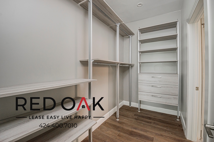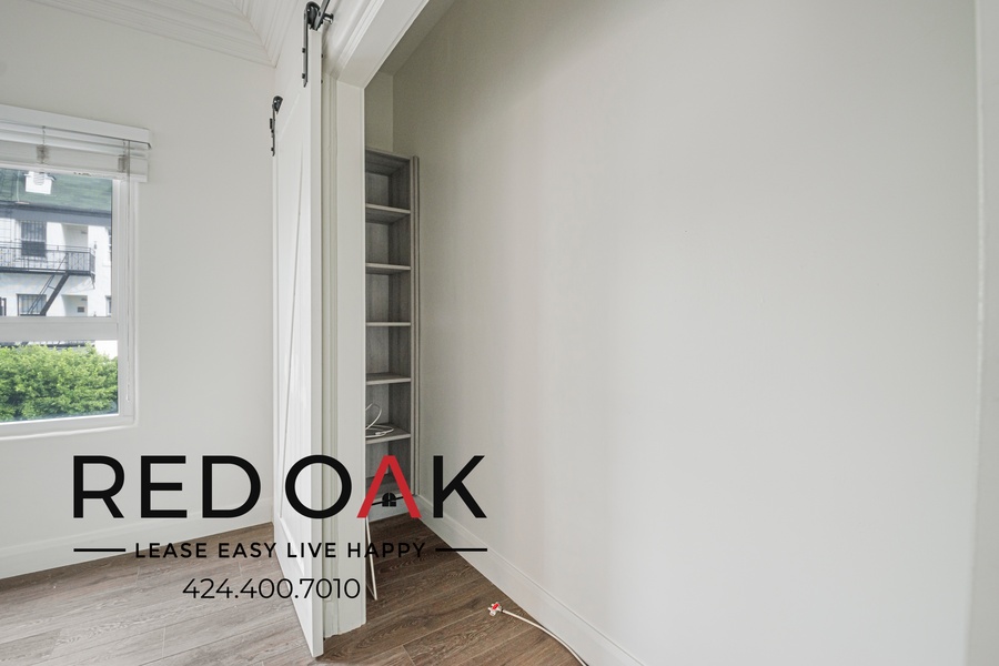 ~ Sorage: Walk-in storage space with shelves and cabinets and ample closet with sliding doors.