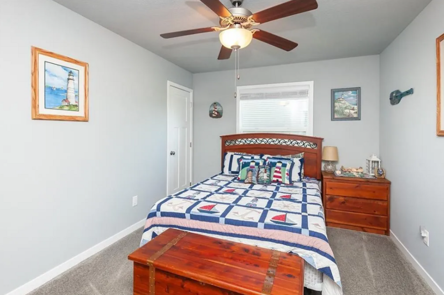 Inside the living room, you'll find new in-ceiling lighting and stylish floating shelves by the fireplace. The home includes blinds on every window, with most being blackout pull-down style for excellent light control. All bedrooms include ceiling fans for year-round comfort.