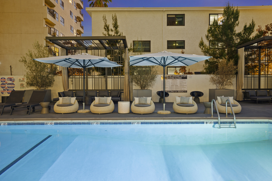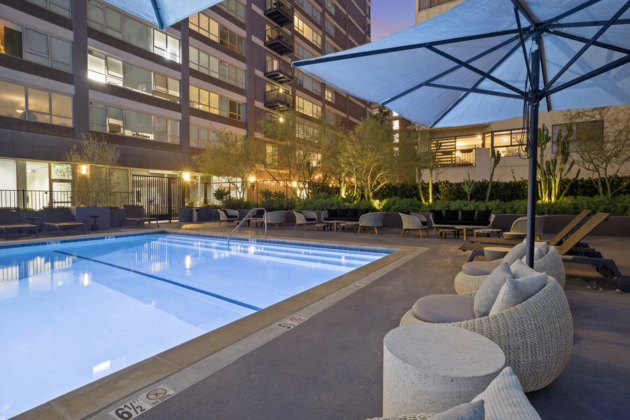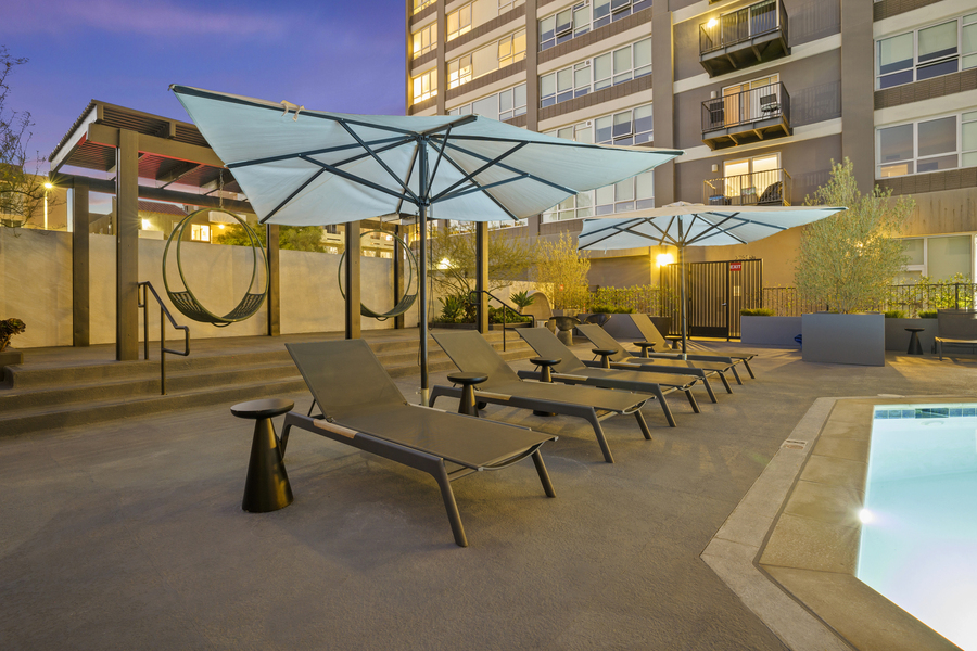 Bedrooms boast designer carpets and spacious closets. The luxury extends to the bathrooms, adorned with imported Italian tile, soaking tubs, and Grohe fixtures. Each of our apartments in Koreatown comes complete with an LG Combination Washer/Dryer, modern window treatments, and most residences offer breathtaking views of the Los Angeles Skyline or Hollywood Hills