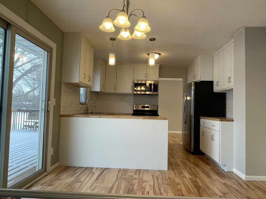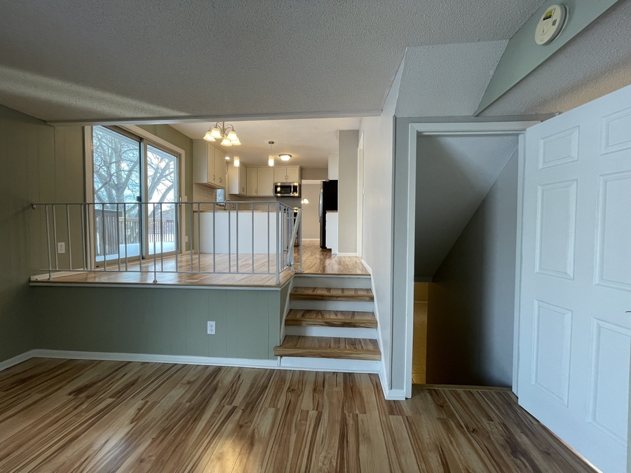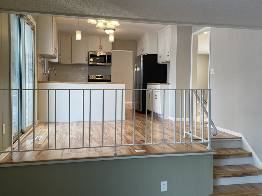 Main level has a large and very functional kitchen with both a designated dining and living room area.