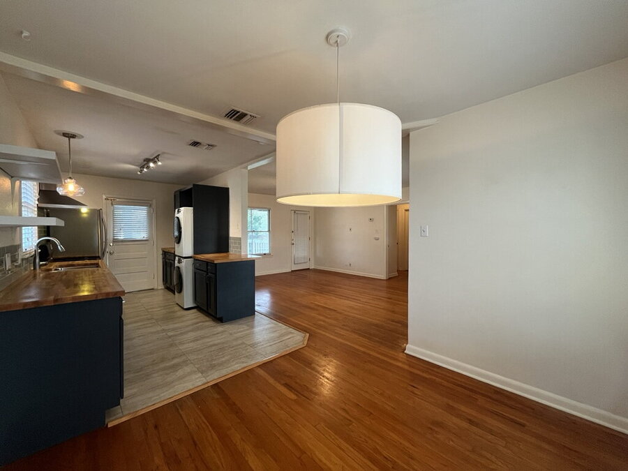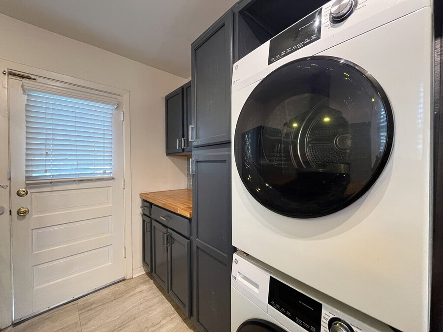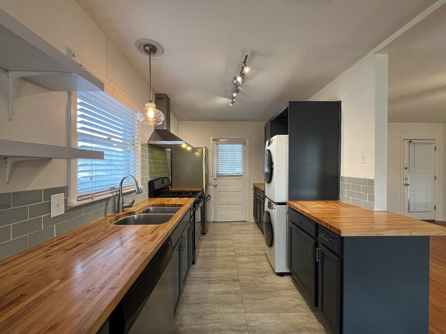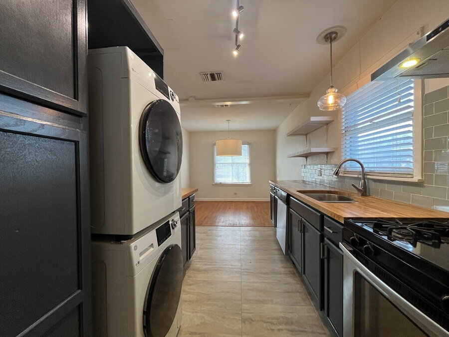 The well-appointed kitchen features solid countertops, a gas stove, dishwasher, microwave, and refrigerator, plus a convenient stacked washer and dryer tucked neatly into the adjoining laundry space. The primary bedroom offers a calm retreat with an ensuite that includes multiple closets for easy organization.