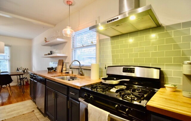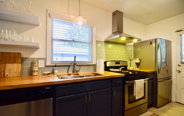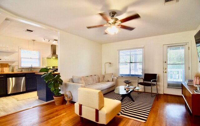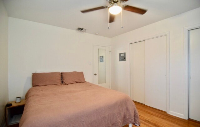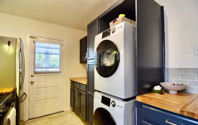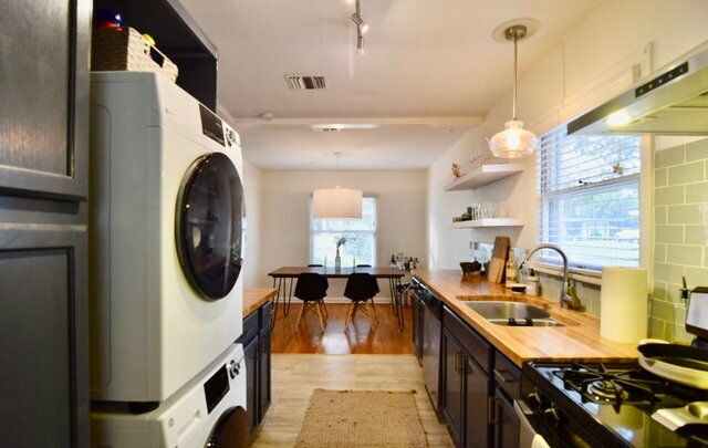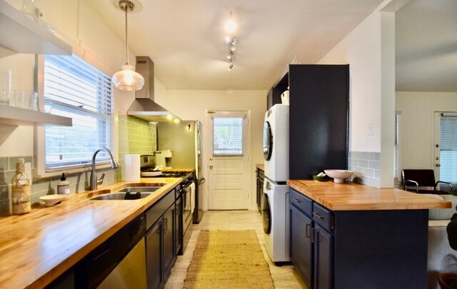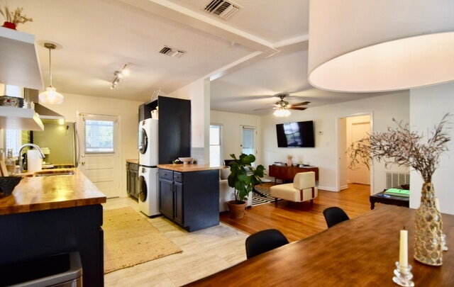 The well-appointed kitchen features solid countertops, a gas stove, dishwasher, microwave, and refrigerator, plus a convenient stacked washer and dryer tucked neatly into the adjoining laundry space. The primary bedroom offers a calm retreat with an ensuite that includes multiple closets for easy organization.