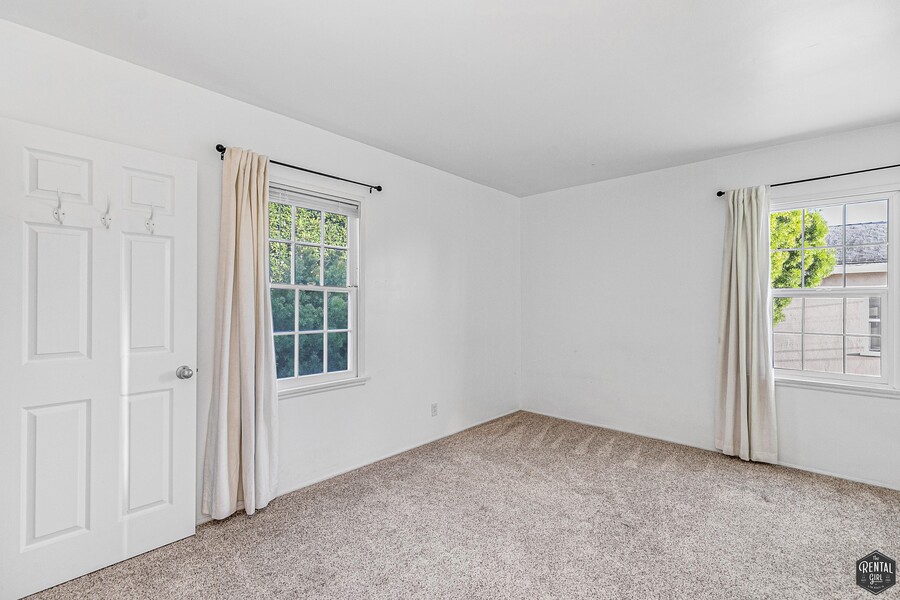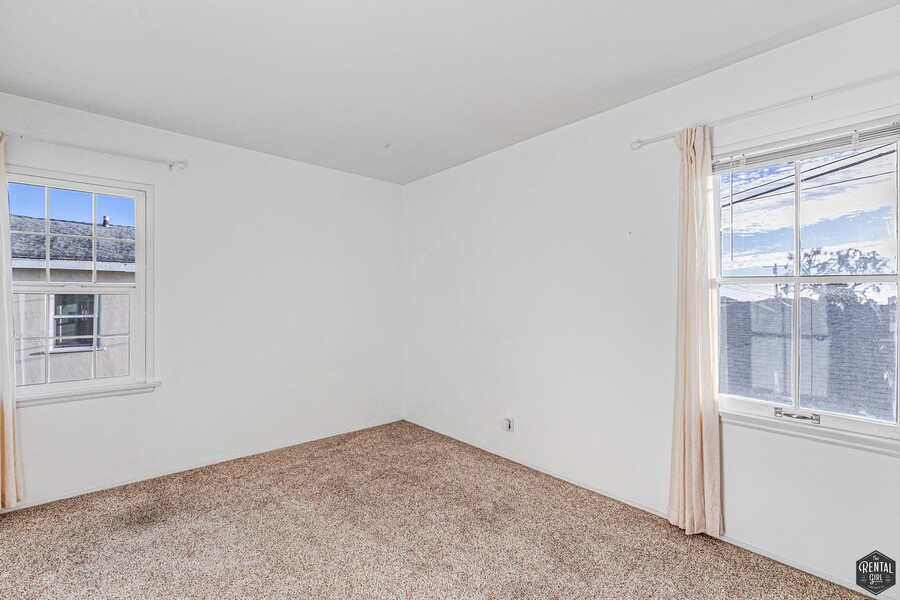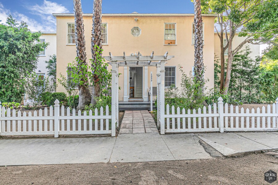 Tucked inside a quaint, well-maintained complex with a white picket fence and lush greenery, this 2-bedroom, 1-bath unit blends vintage character with thoughtful updates. You’ll love the gleaming hardwood floors in the living space, the plush carpet underfoot in the bedrooms, and the sunlight pouring through oversized windows on the top floor.