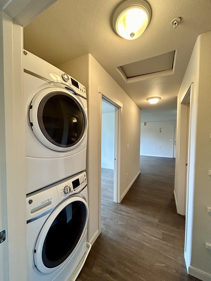 Granite countertops in the kitchen provide a beautiful space for meal preparation and entertaining guests. Say goodbye to trips to the laundromat with a full-size front loadable washer and dryer conveniently located in your unit.