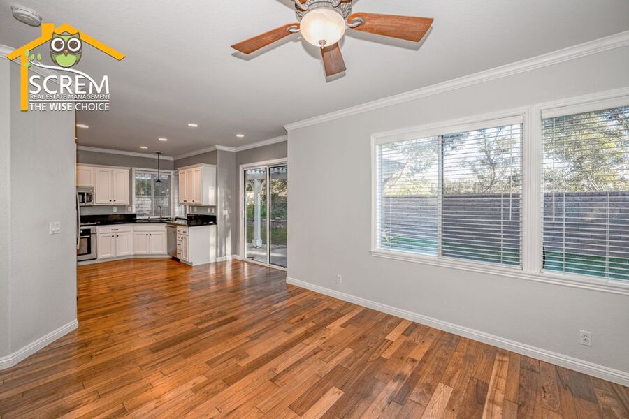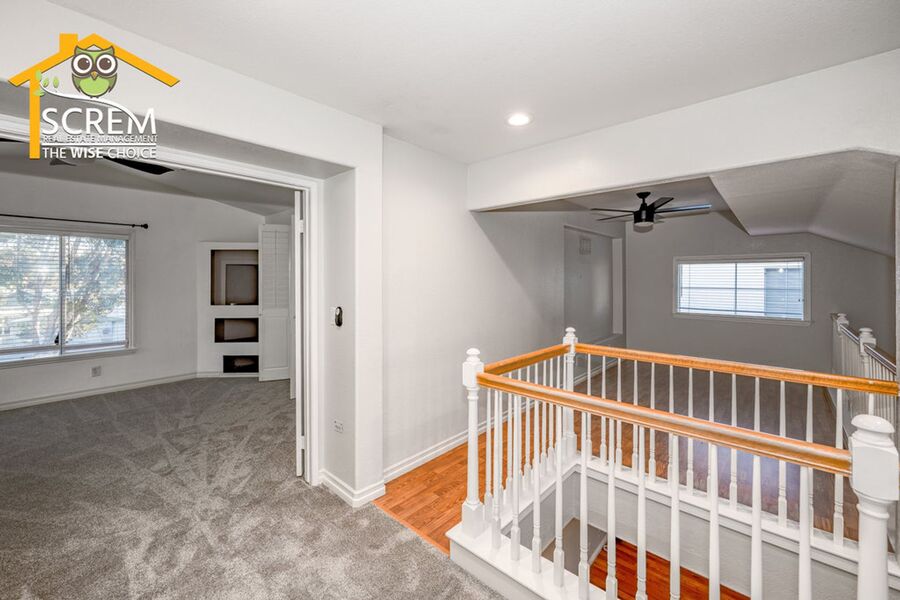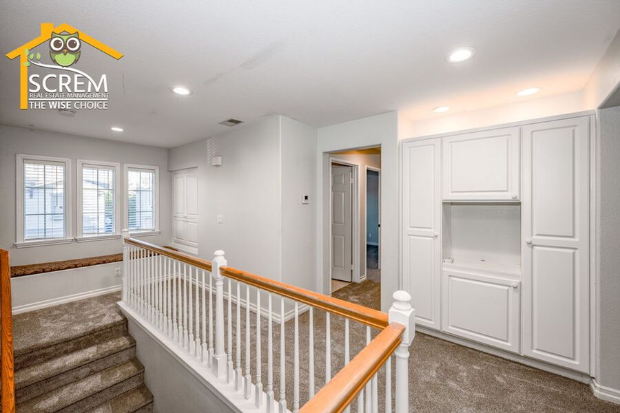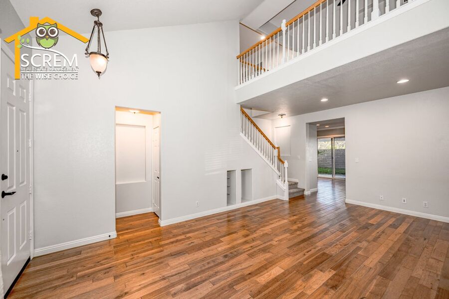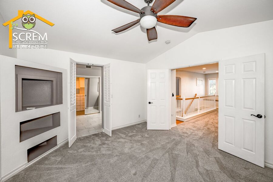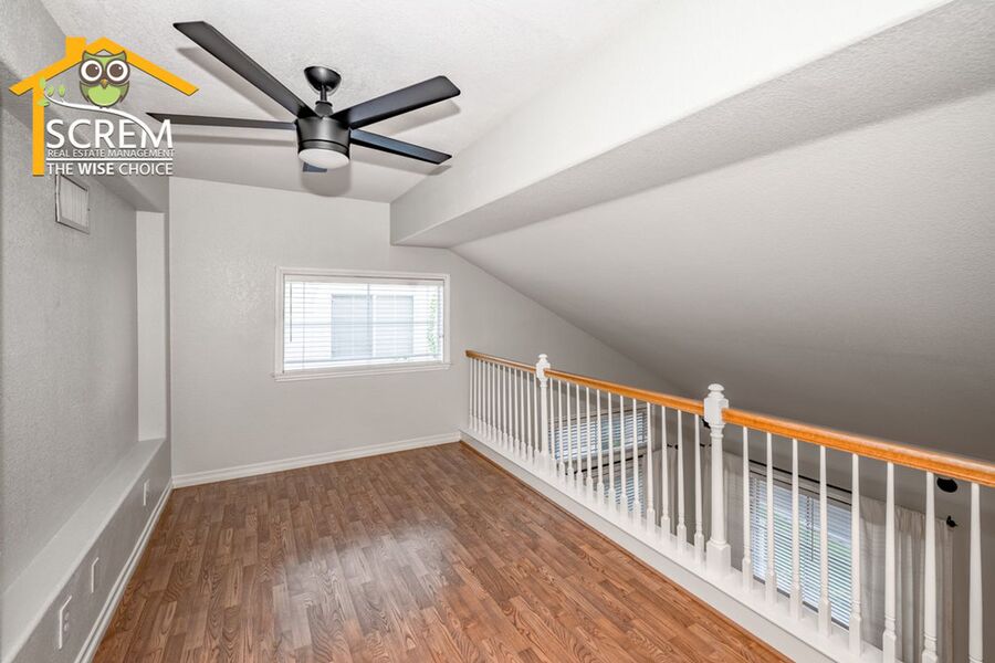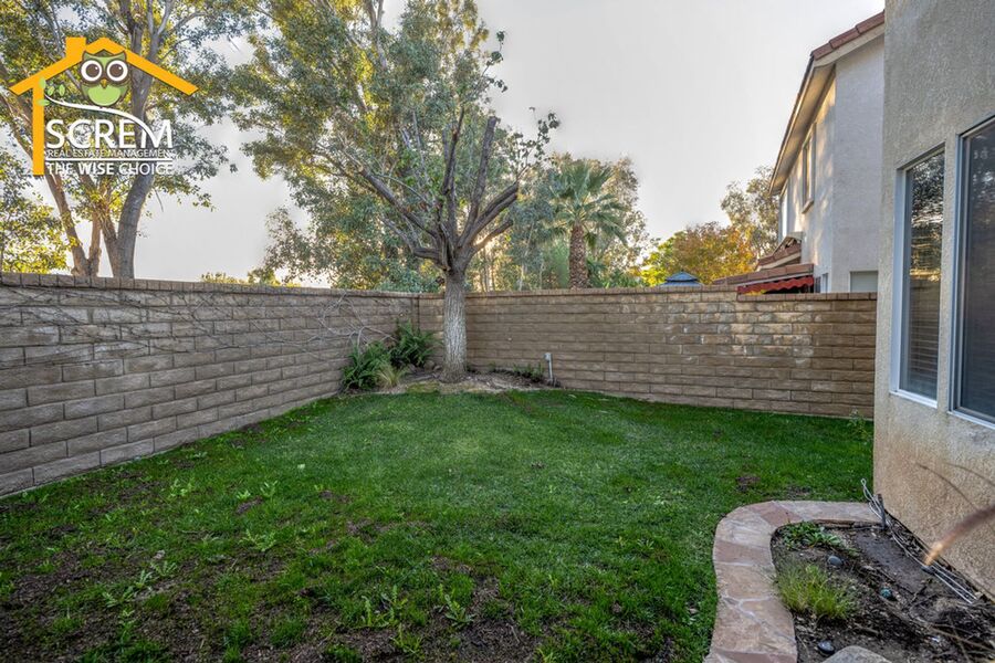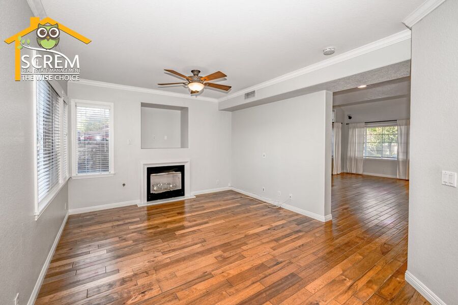 Beautiful three-bedroom home plus a loft in Northpark. Enter into the spacious formal living room and dining area featuring lovely hardwood floors and vaulted ceilings. The kitchen is equipped with stainless steel appliances, granite countertops, hardwood floors, recessed lighting, and a pantry. The dining area opens to the family room, which has a sliding glass door leading to a beautifully landscaped backyard with a covered patio and mature landscaping. The family room also boasts hardwood floors, a fireplace with an entertainment niche, and a ceiling fan. The half bathroom on the main floor features a custom vanity with a granite countertop and hardwood floors. Upstairs, you'll find a window bench seat with storage at the landing of the staircase, a hallway with a built-in cabinet, and a spacious loft complete with a designer ceiling fan and hardwood floors. There are two guest bedrooms, both with closet organizers and new carpet; one of them includes a walk-in closet. The full guest bathroom is conveniently located nearby. The primary bedroom features new carpeting, vaulted ceilings with a designer ceiling fan, a corner entertainment niche, a walk-in closet with mirrored doors, and an attached primary bathroom with double sinks, an oval bathtub, and a separate walk-in shower. Additional features of the home include a convenient upstairs washer and dryer, and a two-car garage. Enjoy access to HOA amenities such as multiple pools, spas, tennis courts, and a basketball court. The home is also conveniently located near shopping, restaurants, and schools. *Owner may consider a small pet.