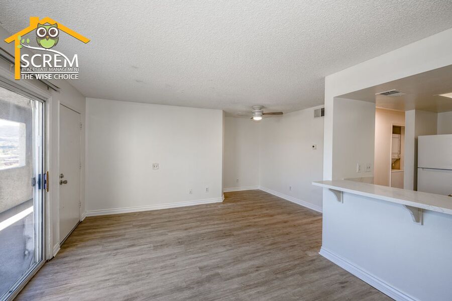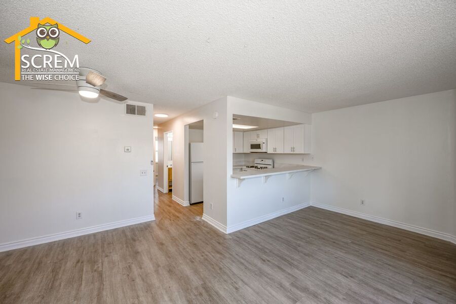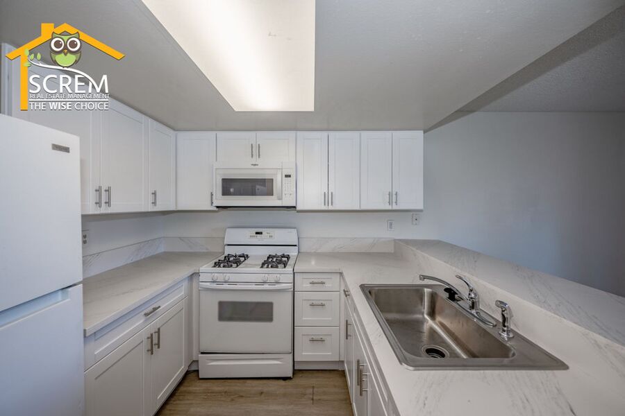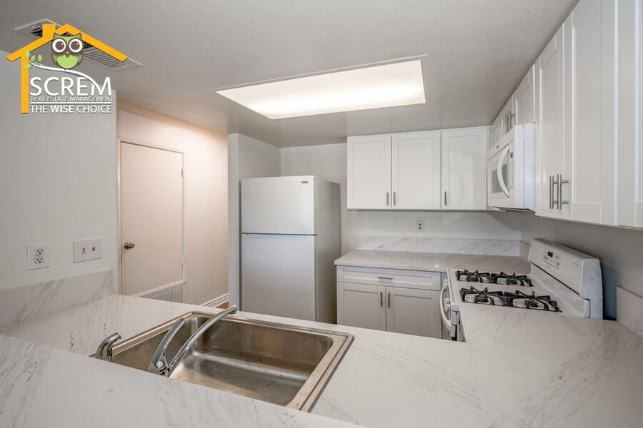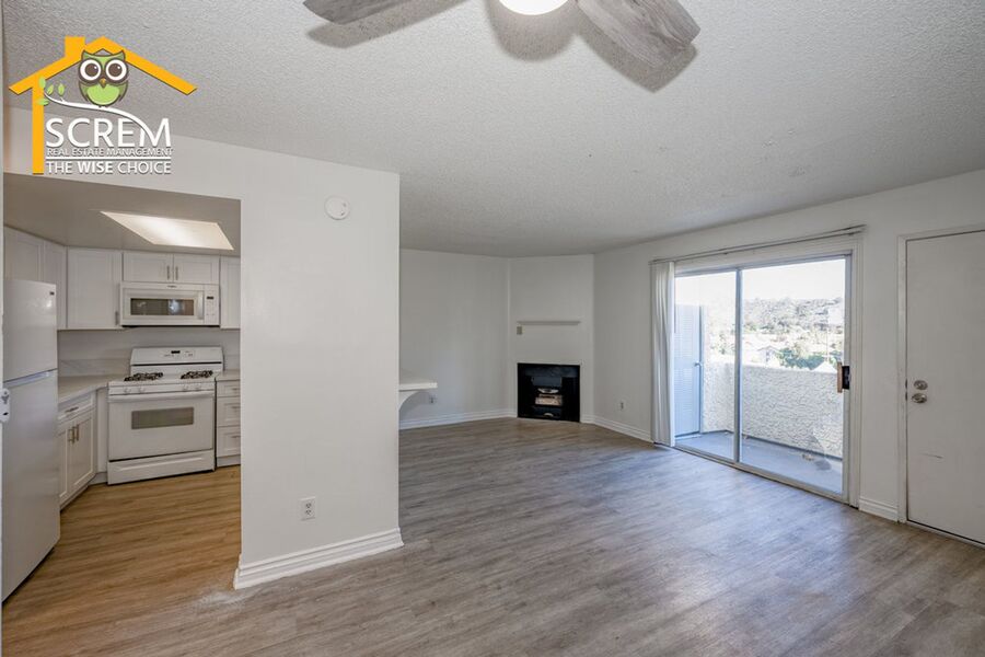 Beautifully updated two-bedroom, two-bathroom condo located in a gated community in Canyon Country. The open living and dining room features modern vinyl plank flooring, a ceiling fan, a cozy corner fireplace, and a sliding glass door that leads to the front entrance with lovely mountain views. The recently updated kitchen features quartz countertops, white soft-closing cabinets and drawers with brushed-silver hardware, a breakfast bar that opens to the living area, and all essential appliances, including a gas stove, single oven, microwave, dishwasher, and refrigerator. The primary bedroom includes vinyl plank flooring, two spacious closets, and an attached updated bathroom with a newer vanity and a walk-in shower. The guest bedroom is spacious and sits next to an updated full bathroom with a new vanity. Additional conveniences include a stackable washer and dryer in the hallway and an attached two-car shared tandem garage. Water and trash are included in the rent. *Owner may consider a small pet.