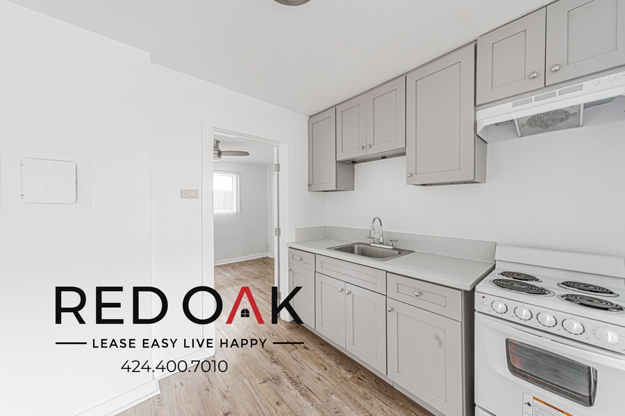 • Full Kitchen: Electric range and plenty of cabinet storage for all your cooking needs.