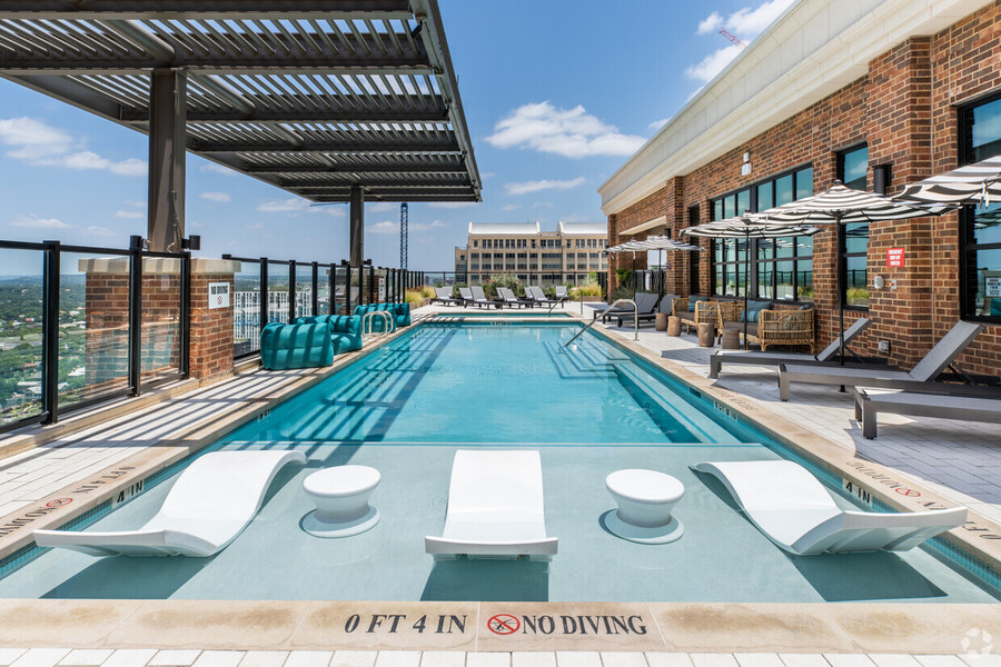 Rooftop pool with hot tub, fire pit, and sun loungers