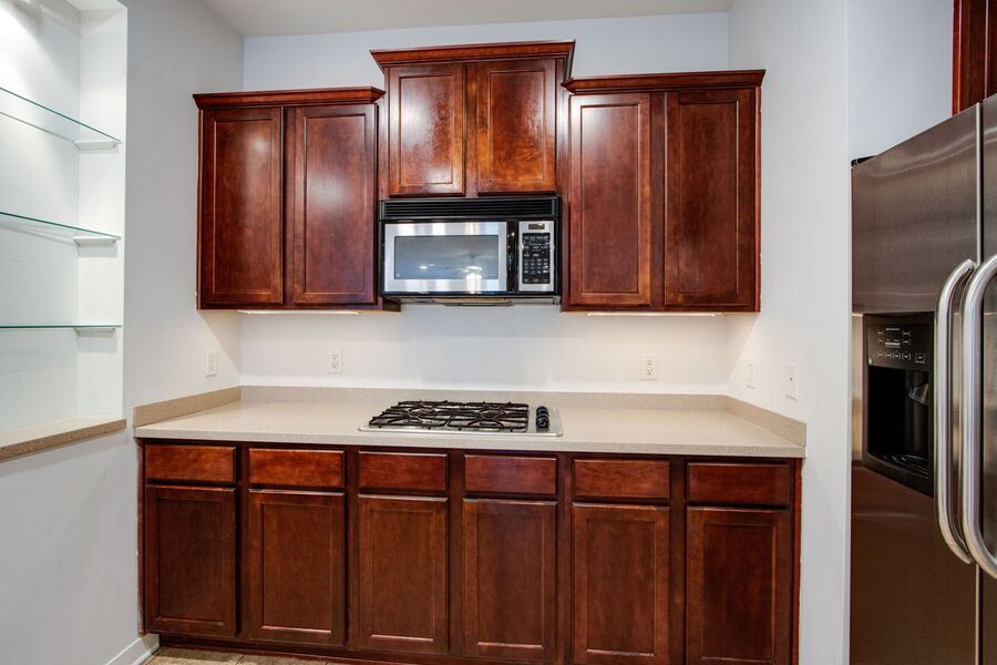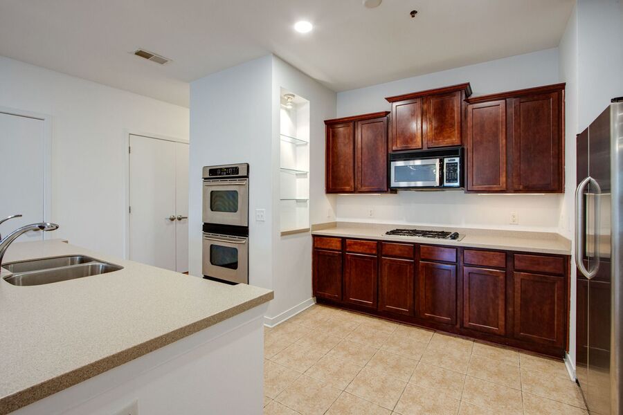 The spacious living area features hardwood flooring, a fireplace, and direct access to a private balcony overlooking the Mississippi River. The open kitchen includes stainless steel appliances, dual ovens, and a large breakfast bar with plenty of space for seating.