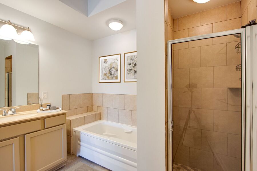 The primary bedroom offers a large dressing closet and a private en suite bathroom with a glass-enclosed shower and soaking tub. Two additional bedrooms are generously sized and share a full bathroom.