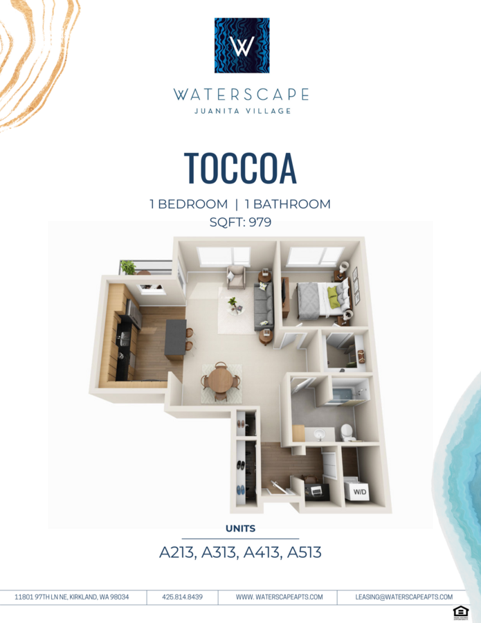 Welcome to Waterscape at Juanita Village, a vibrant lakeside community nestled in the heart of Kirkland. These thoughtfully designed apartment homes offer the perfect blend of comfort, convenience, and urban charm, with stunning views of Lake Washington. Each residence features spacious layouts, upscale finishes, and private patios or balconies- ideal for enjoying the serene surroundings. With waterfront trails, local cafés, boutique shopping, and entertainment options just blocks away, Waterscape delivers a modern living experience in one of the area’s most sought-after neighborhoods.