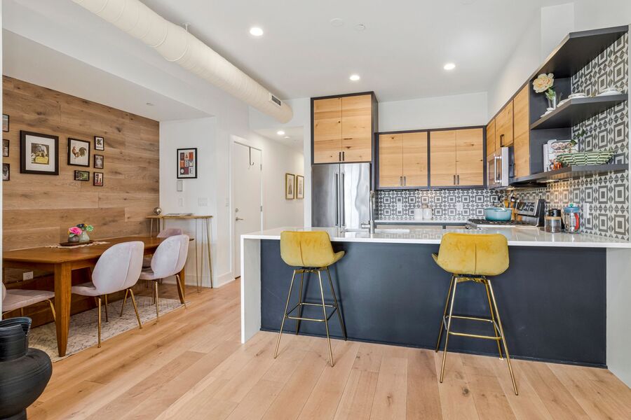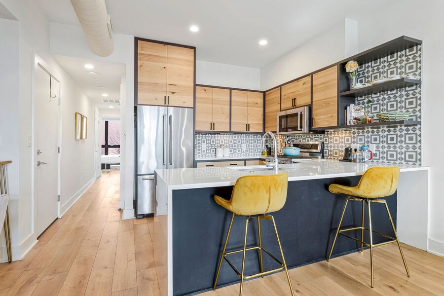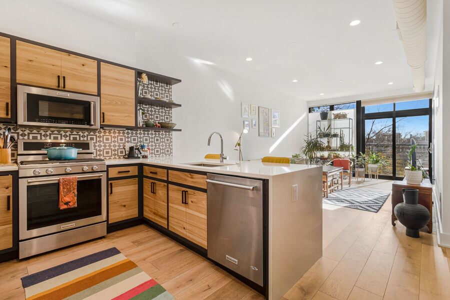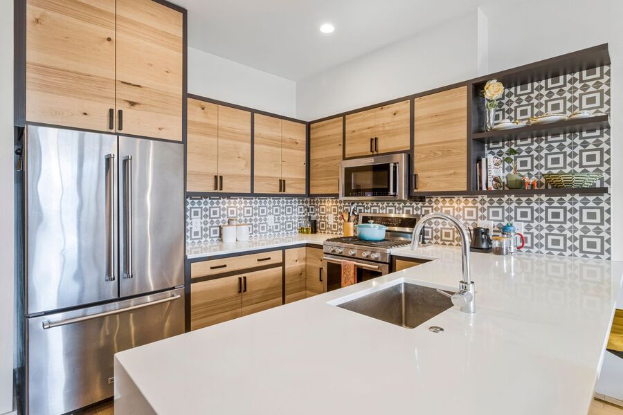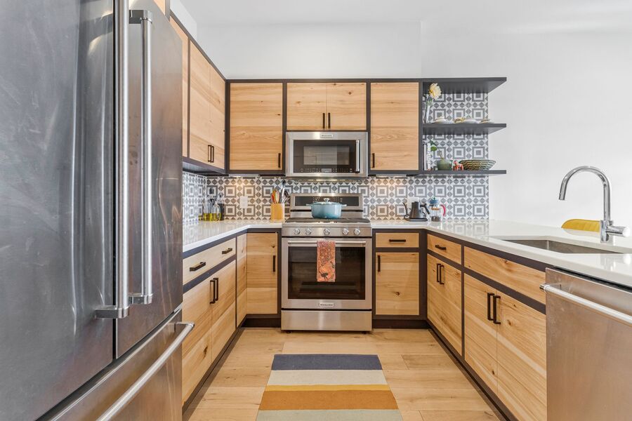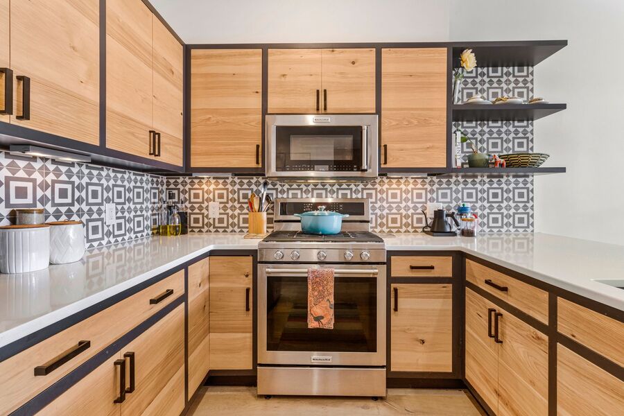• Sleek modern kitchen with stainless steel appliances, gas range, and ample cabinetry