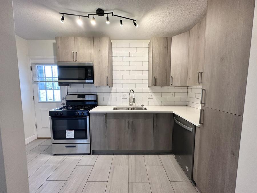 All-New Kitchen: Prepare culinary delights in style with a completely revamped kitchen, equipped with modern grey cabinetry, solid surface countertops, and top-of-the-line stainless steel appliances.