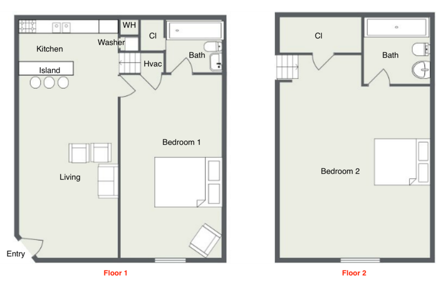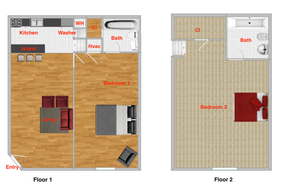 Two full bathrooms and two spacious bedrooms, each with walk-in closets