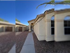 Grass/desert rear yard with covered patio and block fence
