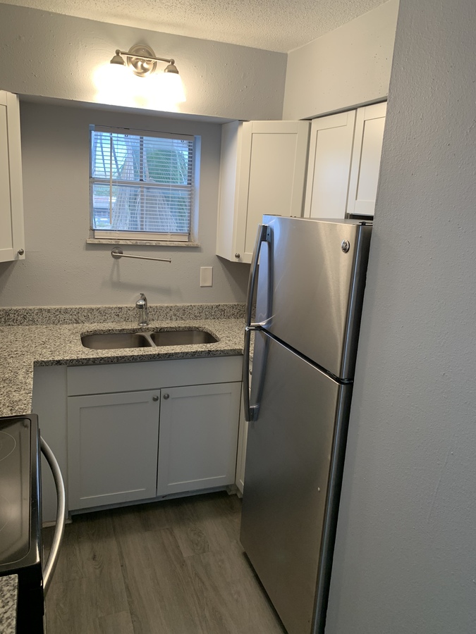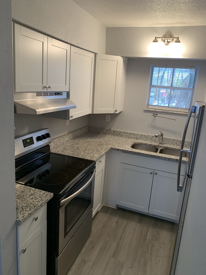 Remodeled kitchen granite countertops, stainless steel appliances and white cabinets