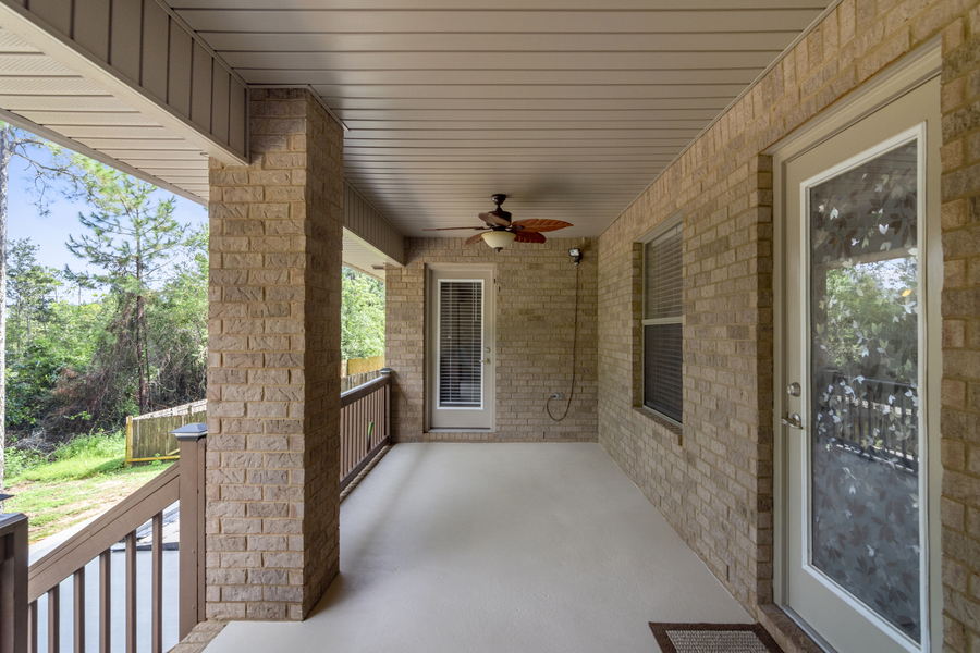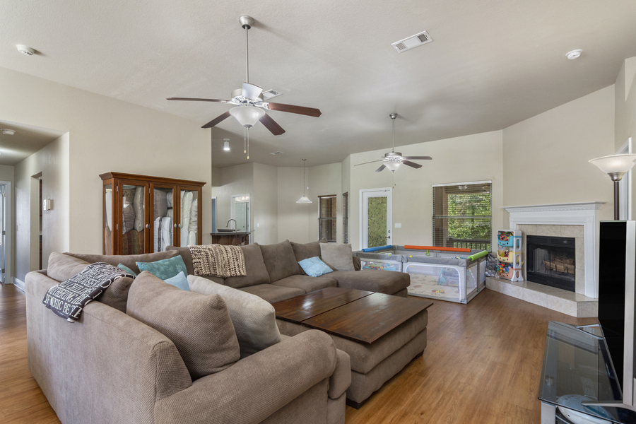 Soaring 9-foot ceilings and floor-to-ceiling windows create a light, airy atmosphere throughout. The living room features a cozy fireplace, double ceiling fans, decorative ledges, and a soothing neutral palette to match any style.