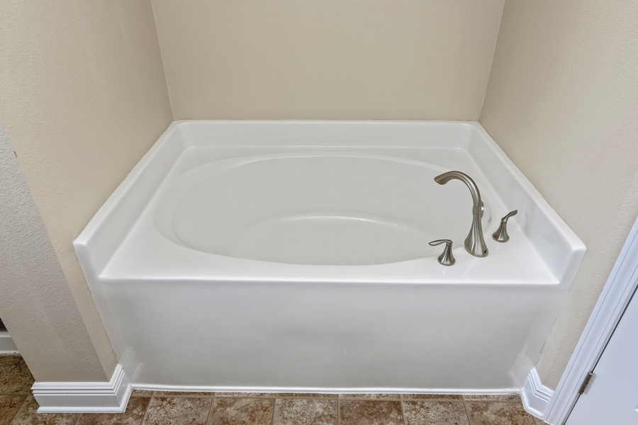 Retreat to the dreamy master suite with elegant tray ceilings, a ceiling fan, and durable wood flooring. The ensuite bathroom includes double vanities, a garden soaking tub, walk-in shower, and generous closet space.