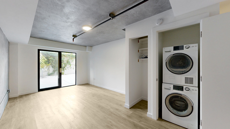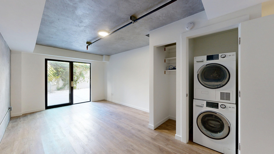 The studio features polished concrete floors, updated finishes throughout, and the convenience of a stackable washer and dryer in unit. Residents also enjoy access to a shared roof deck with stunning city views.