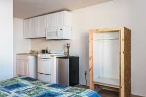 Welcome to your perfect one-floor living solution! This updated unit features hard floors and a convenient kitchenette with a 4 burner electric range, refrigerator, and microwave - perfect for easy meal preparation.