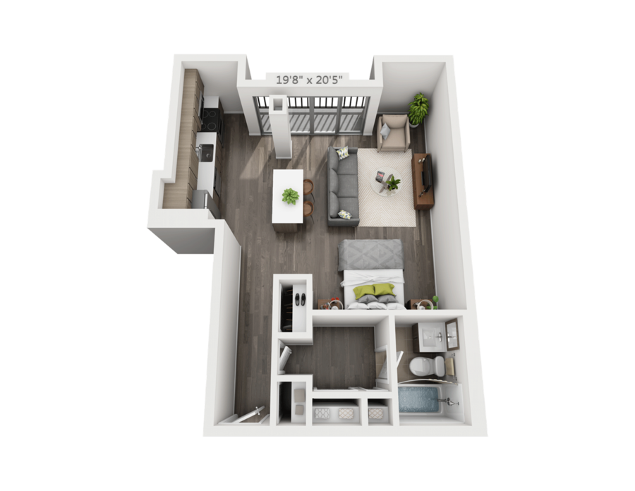 This studio apartment is designed for efficiency without compromising style, featuring a kitchen open to the living space with a sleek kitchen island perfect for meal prep or casual dining. Select units also include a private balcony, extending the living space outdoors. Hardwood floors run throughout the unit, creating a modern feel.