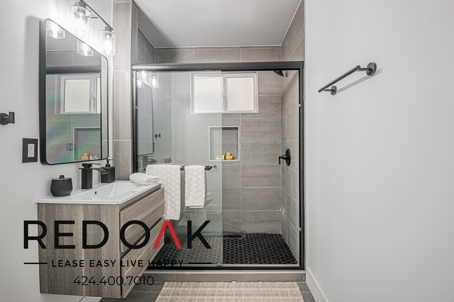 ~ Refreshing Bath: Well-lit mirror, hardwood vanity, and walk-in shower.