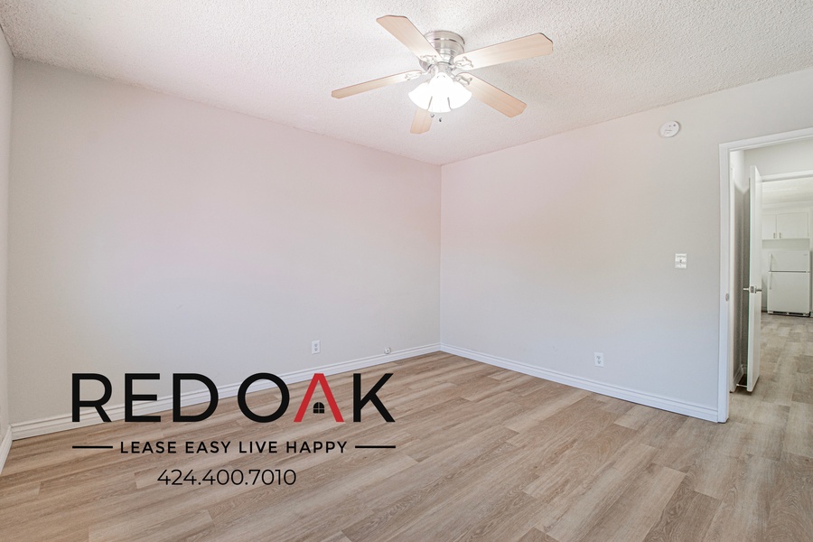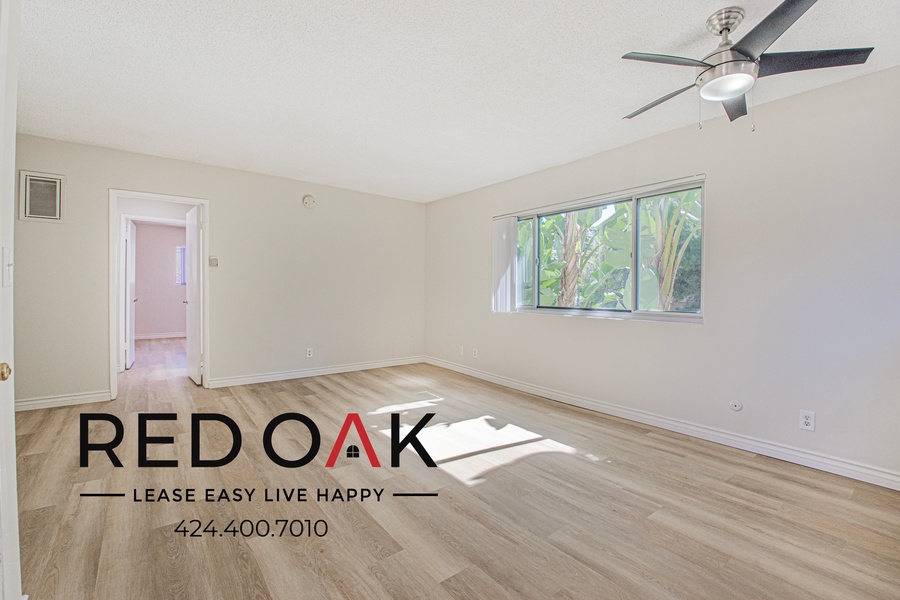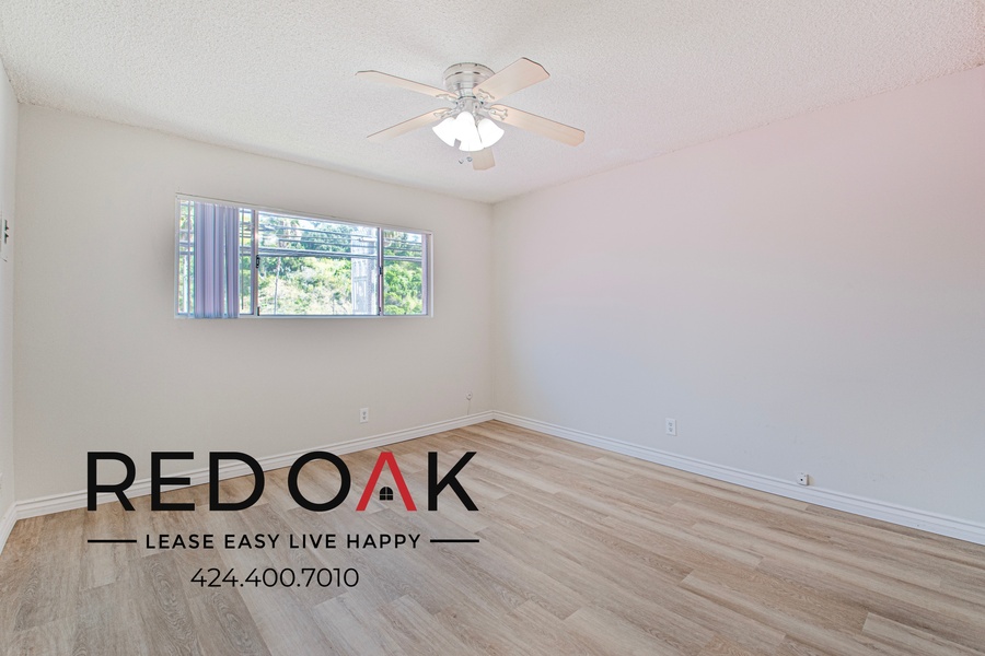 ~ Peaceful Retreat: Spacious bedroom with a mirrored closet and ceiling fan.