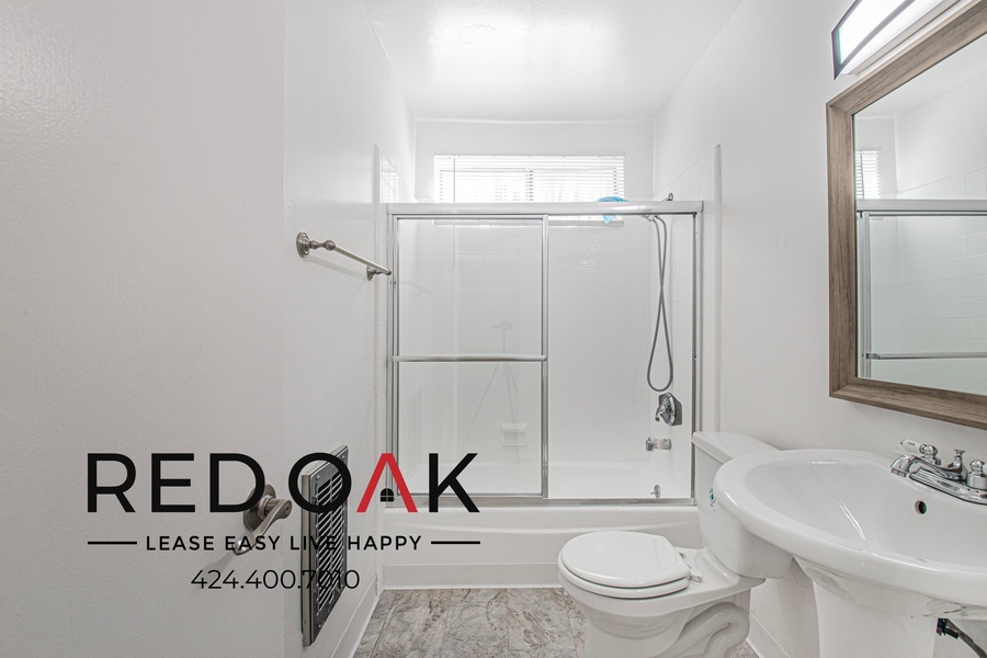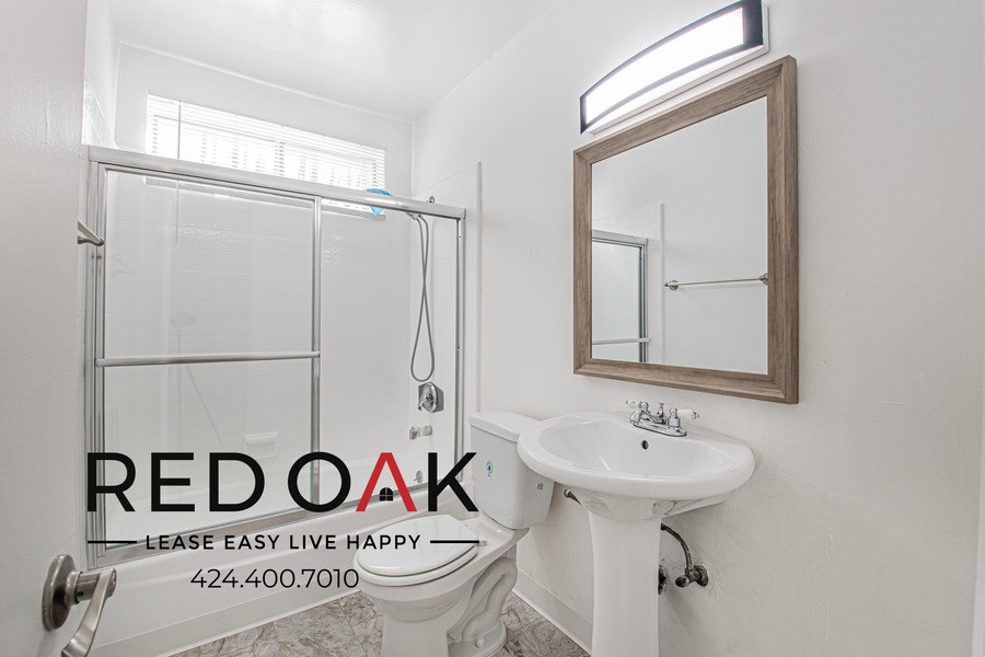 ~ Refreshing Bath: Well-lit mirror, hardwood vanity, and soaking tub/shower.