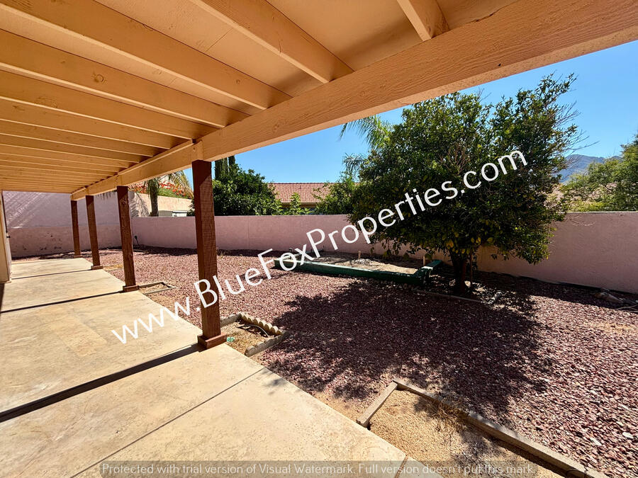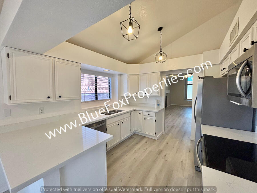 This stunning 3 bedroom, 2 bathroom, 2 car garage contemporary home is a must-see! It features a cathedral ceiling, a spacious family room with a fireplace great for entertaining, and a bright living room/dining room area that leads into the gorgeous kitchen with stainless steel appliances and lots of cabinet and counter space. The primary has 2 closets and a back door that gives you direct access to the back. The bath has a shower, and double-sink vanity. In the back, you will find the large covered patio and a low-maintenance backyard. Enjoy ceiling fans in all bedrooms and window coverings throughout, washer and dryer hookups.