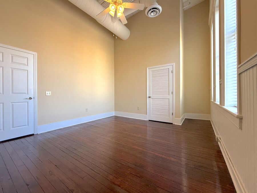Discover this charming 2-bedroom, 1-bath loft in downtown Macon with a mix of historic character and modern convenience. Hardwood floors, high ceilings, large windows and abundant natural light create an inviting open-concept living space centered around a decorative fireplace and elegant French doors. Spacious kitchen feeds into open concept living room with plenty of space for entertaining. Practical features include in-unit laundry, ceiling fans, elevator access, and extra storage space. Walk across the street to the newly renovated Rosa Square Park and enjoy the weather. Located in a historic building within walking distance to tons of downtown amenities, this residence offers easy access to shops and restaurants in a highly convenient location.