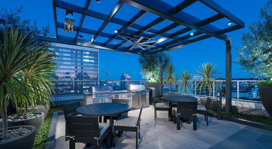 Rooftop lounge with indoor-outdoor bar and social areas
