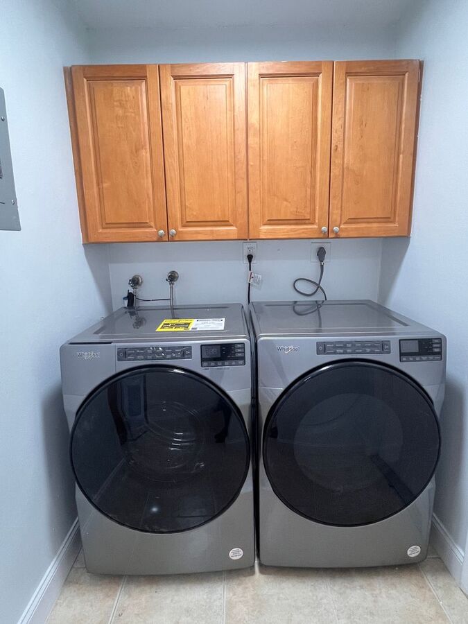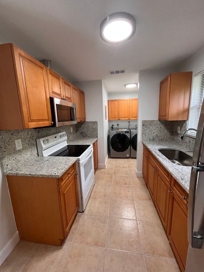 Stunning and spacious 2 bedroom 1 bath apartment with ceramic tile floors throughout entire home. Split bedroom floor plan with linen closet between the two bedrooms to allow for added privacy. Bedrooms have ample closet space and come equipped with multi led fan lighting controlled by remote. Bathroom has a stand up shower with upgraded ceramic tile and glass barn door for smooth access. Kitchen has stainless steel appliances with a flat surface stove, new microwave, and stainless steel fridge with top bottom combination. Last but not least, apartment has a laundry room with wooden cabinets above front load washer and dryer! Outside area for BBQ, Private parking in front of property and professionally managed by management company. Close to Downtown, Park, Marina, I95 for easy travels and located close to dining, restaurants and so much more! Inquire within. Call Hellen Rodriguez, Palm Beach Managers LLC 561-877-6285